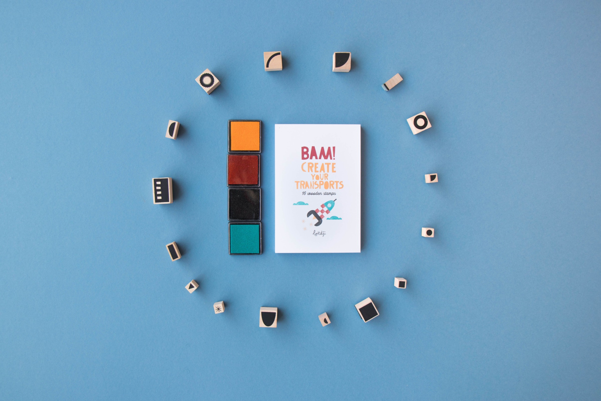 By combining our stamps you will create cars, motorcycles, rockets, planes and much more! The game includes 16 wooden stamps and 4 coloured ink pads. There is also a notebook included for your creations!