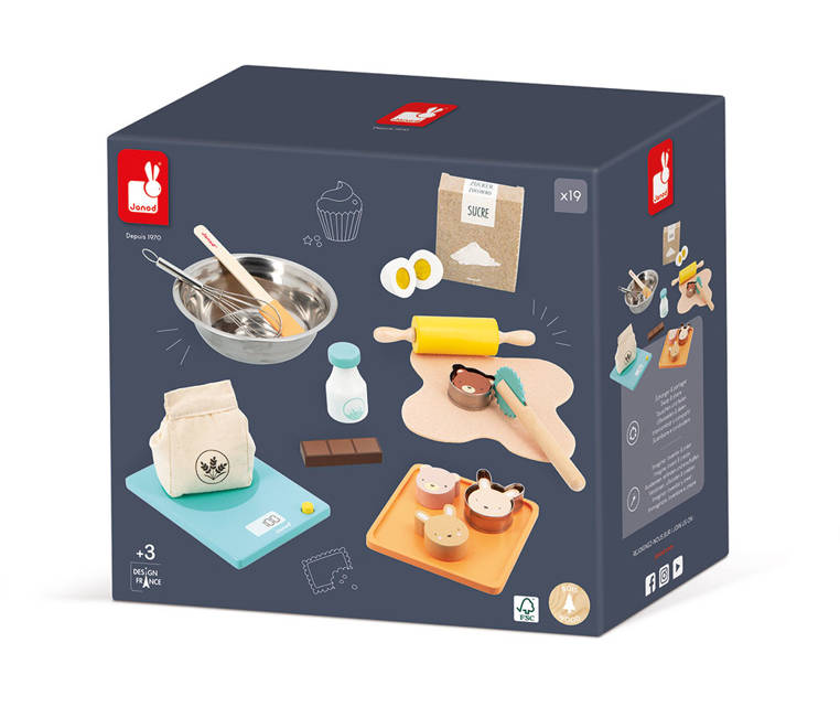 Wooden set. The workshop of the French brand JANOD confectioner consists of 19 elements and will bring a lot of joy to every child. It will allow him to safely participate with his parent in everyday kitchen activities and develop a passion for cooking. The set includes: flour in a linen bag, a carton of sugar, a bottle of milk, an egg (2 parts with Velcro yolk to connect them), a strip of chocolate, rolled out dough, 4 cookies (2 teddy bears and 2 bunnies), wooden kitchen scale, metal kneading bowl and whisk, spatula, rolling pin, cutter, serving tray. Most of the elements are made of FSC wood (obtained from sustainably managed forests) and painted with paints that are safe for children. They are a great complement to any children's kitchen.