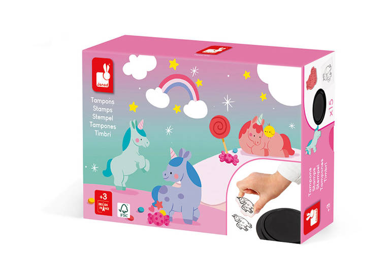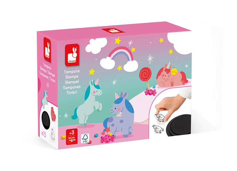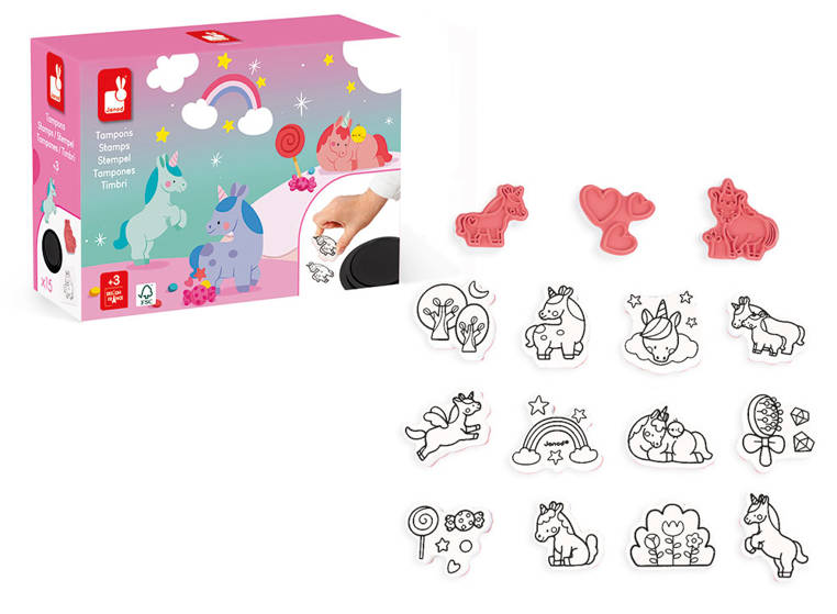 The creative set of Stamps Unicorns by the French brand JANOD includes 15 handy stamps of various shapes with charming graphics, among others. magical unicorns and elements of their fairy-tale world, such as trinkets and sweets. With their help, you can decorate selected surfaces, create unique stories, and color the reflected pictures. The stamps are made of elastic foam that is more pleasant to the touch and a rubber surface on which the imprint image is placed. The set also includes a black ink cushion. Stamping is a long time of engaging and reassuring fun for a child.