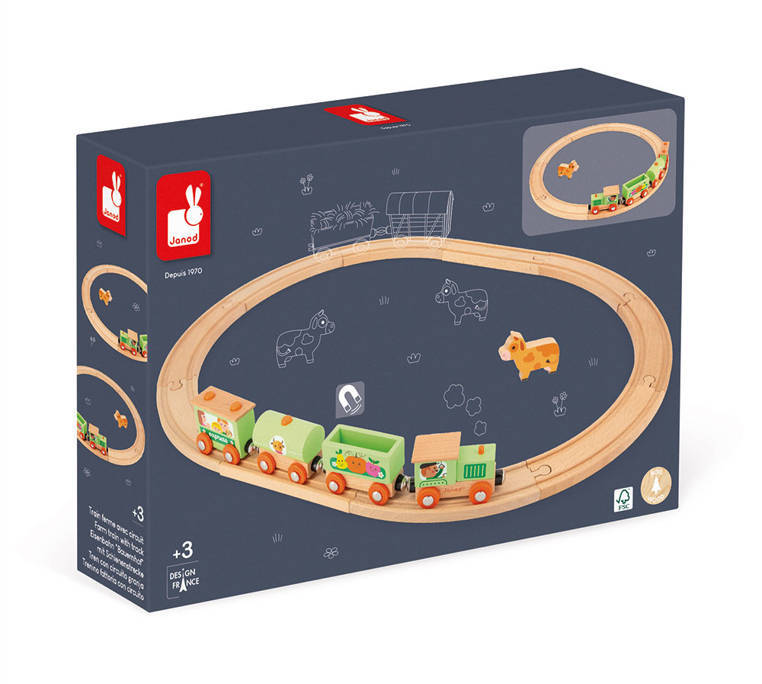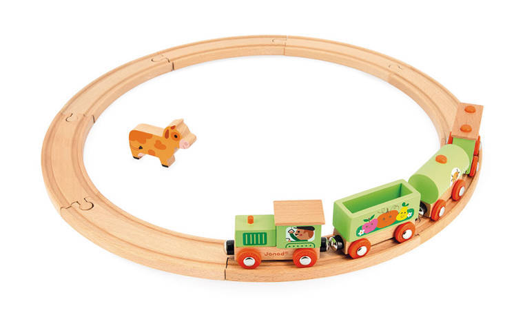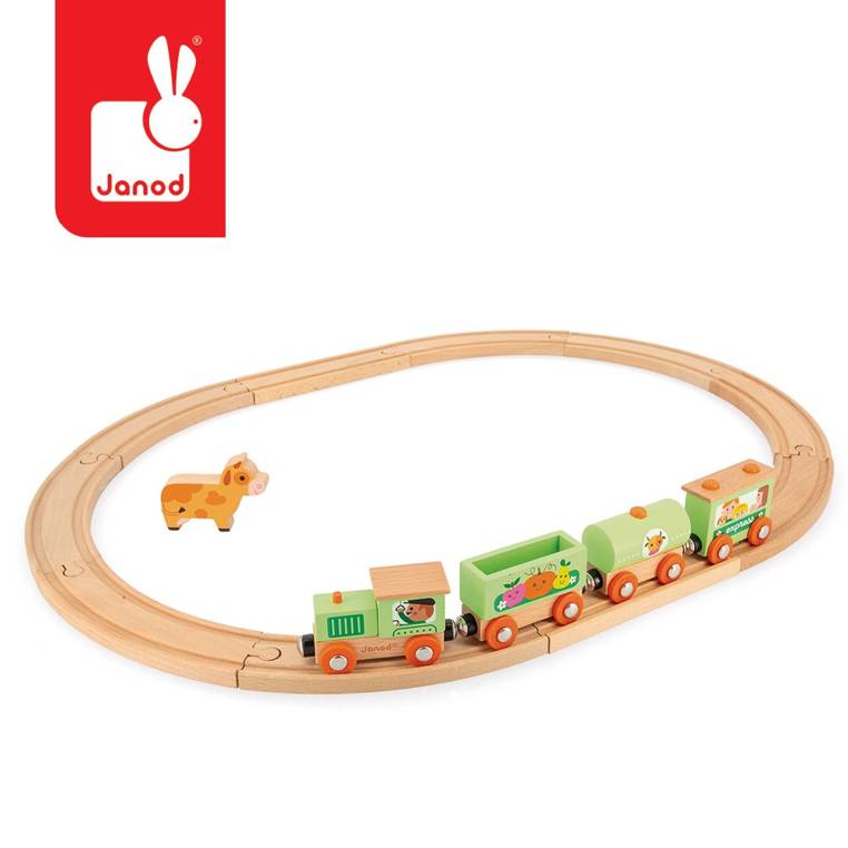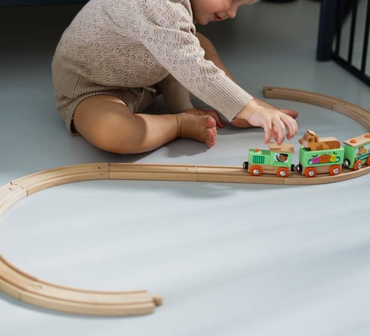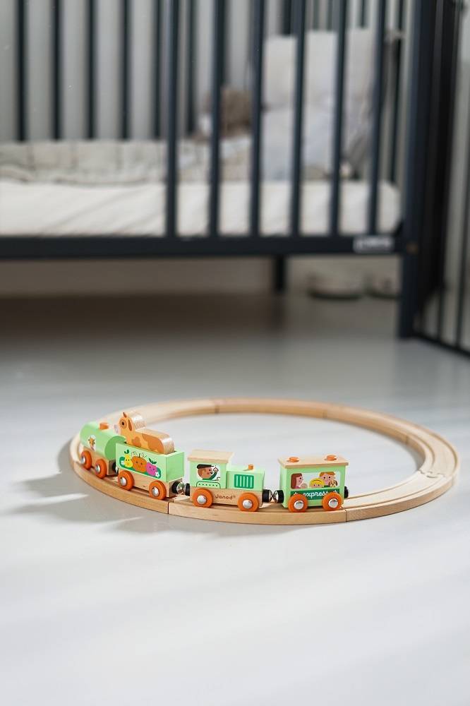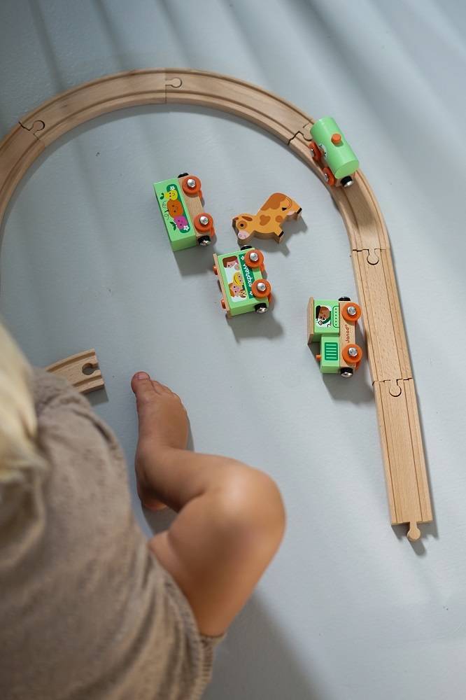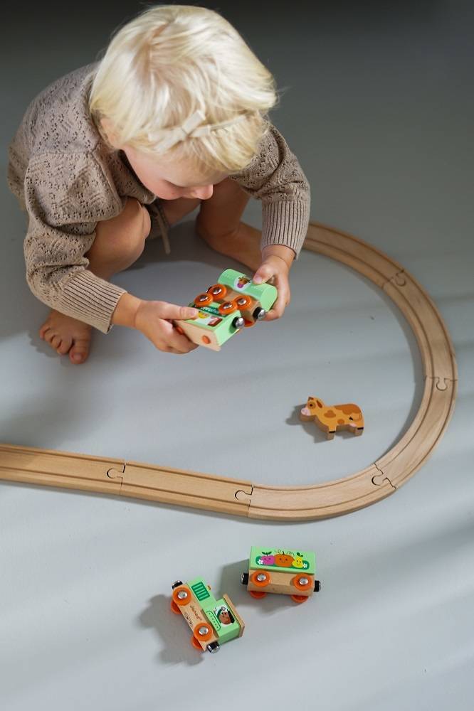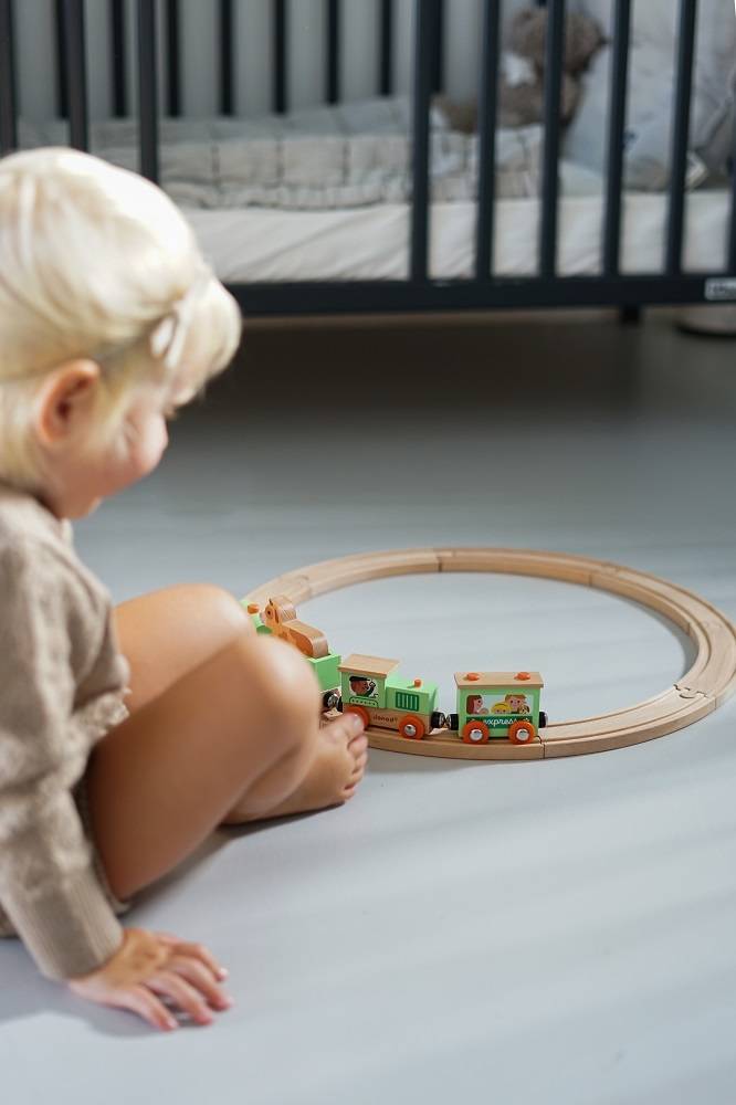 The Farma wooden train from the Story series of the French brand JANOD is the perfect gift for every child. The set consists of 10 tracks, which are connected together to form an oval route for the train and 4 carriages, connected with each other by magnets: a locomotive, a cistern, a passenger car and a car with a figure of a cow. The queue is perfectly made, in shades of pastel green and light wood. The set can be combined with others from the Story series and similar sets from other brands. It also allows you to create many play scenarios with the farm in the lead role.