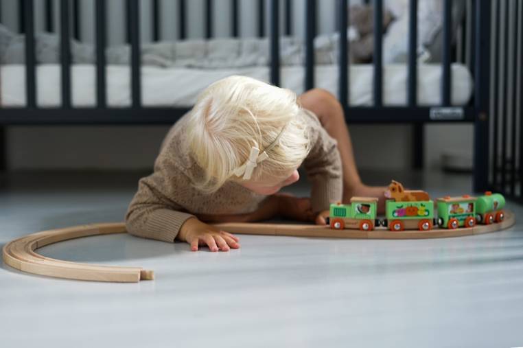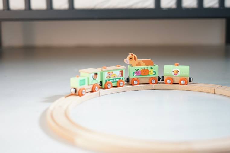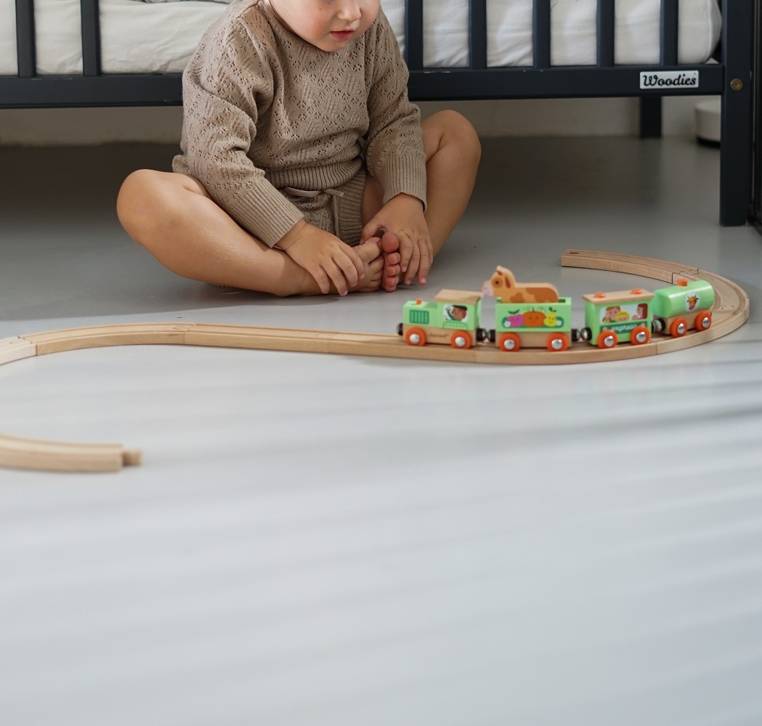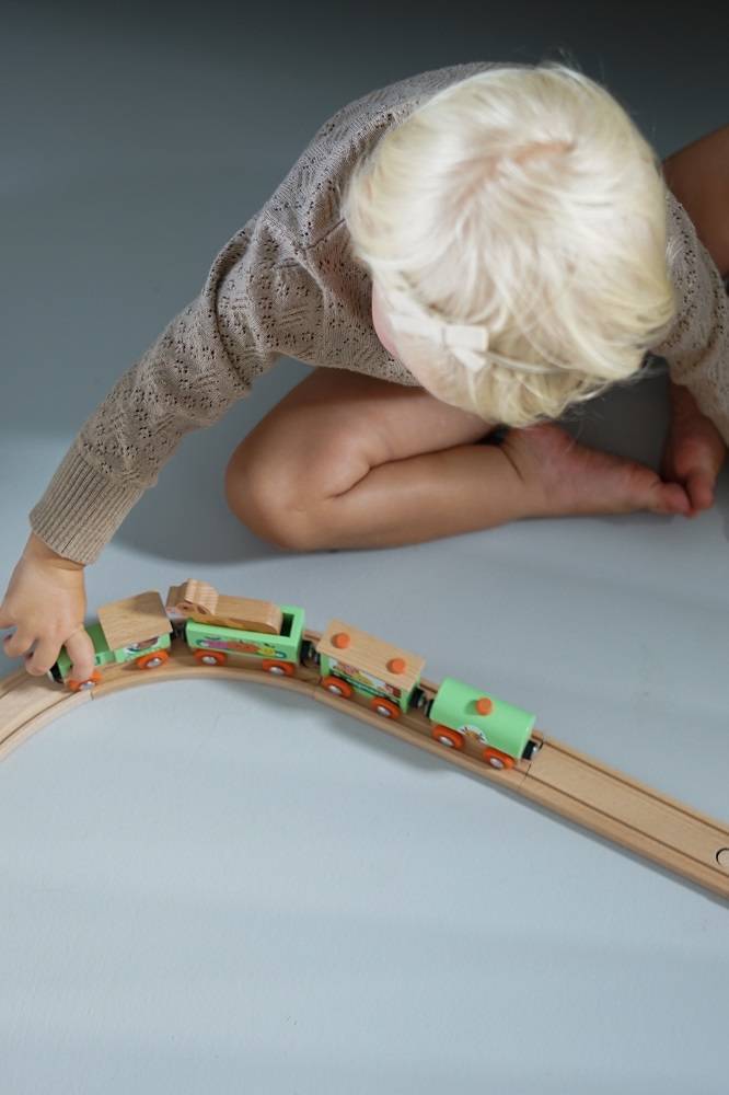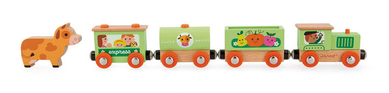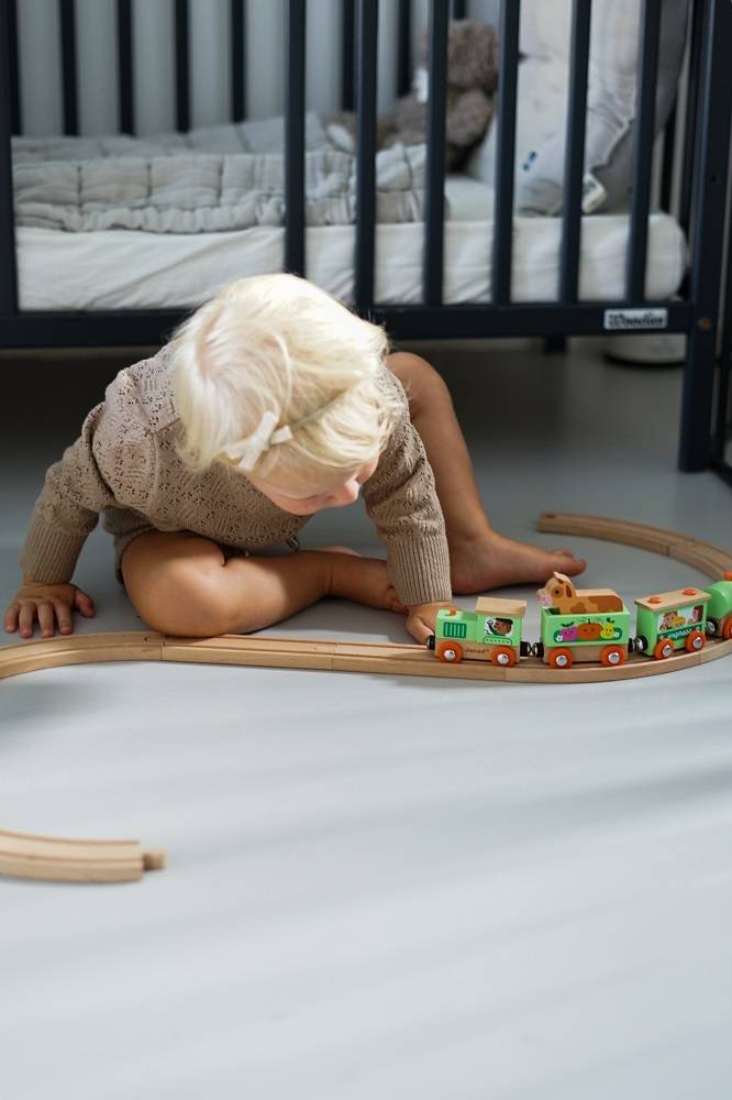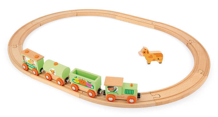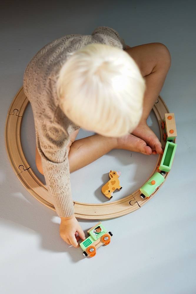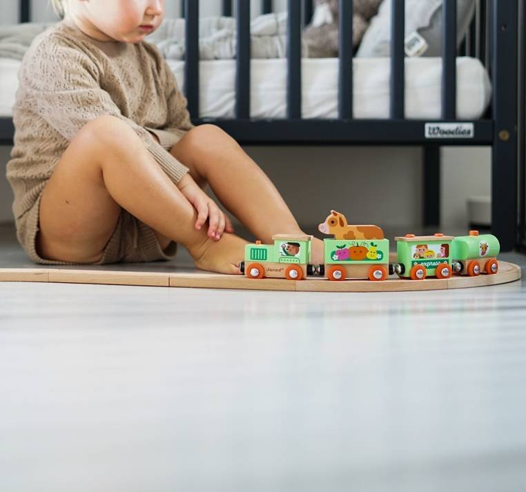 The Farma wooden train from the Story series of the French brand JANOD is the perfect gift for every child. The set consists of 10 tracks, which are connected together to form an oval route for the train and 4 carriages, connected with each other by magnets: a locomotive, a cistern, a passenger car and a car with a figure of a cow. The queue is perfectly made, in shades of pastel green and light wood. The set can be combined with others from the Story series and similar sets from other brands. It also allows you to create many play scenarios with the farm in the lead role.