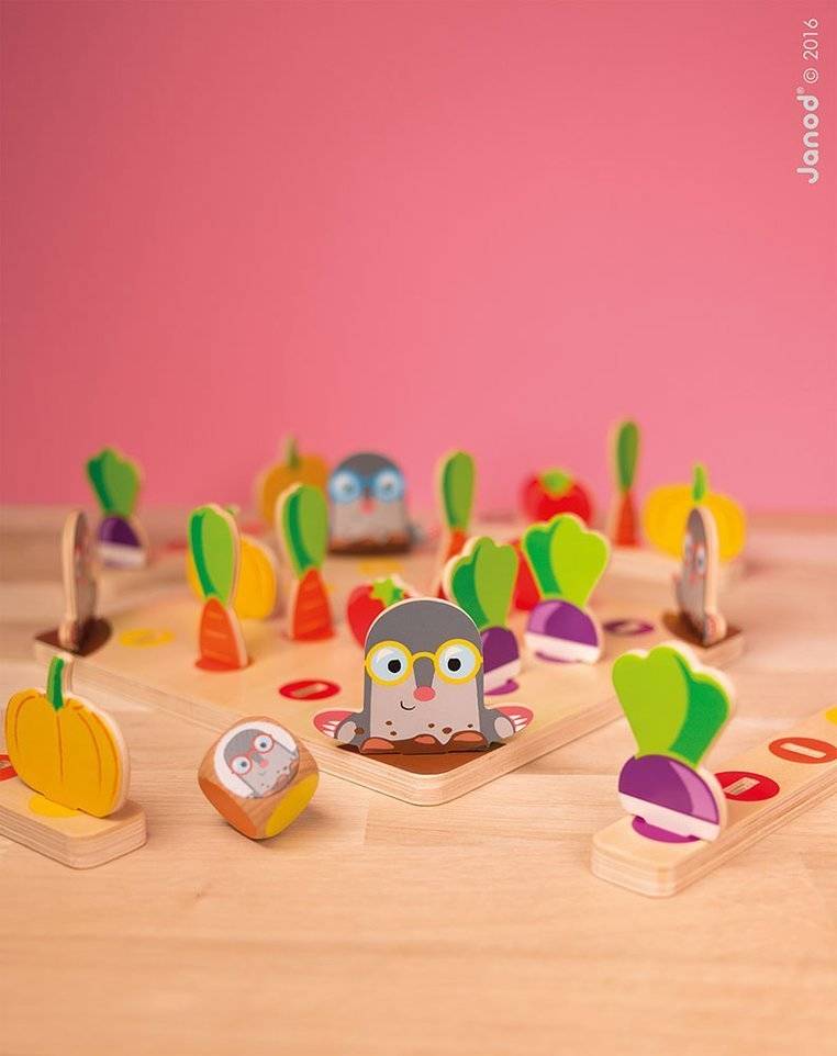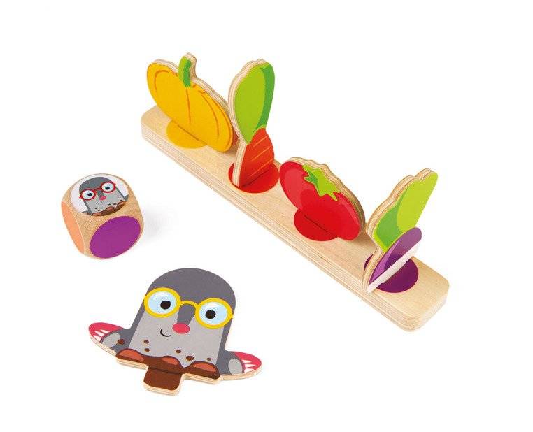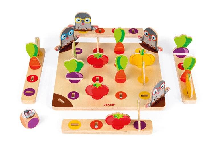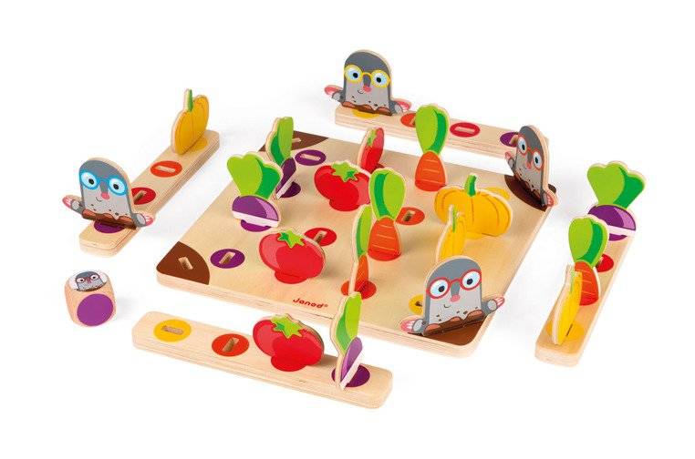 Race game Beware of the mole! French brand JANOD is great fun for two to four people - both children and adults. The set includes a wooden board, coasters and elements that are placed on them, i.e. 4 moles and 4 pieces of vegetables: turnips, tomatoes, carrots and pumpkins, creating a small garden. Players take on the role of gardeners and are tasked with collecting a basket full of crops, showing cleverness and avoiding moles. The first player to get one of each type of vegetable wins.