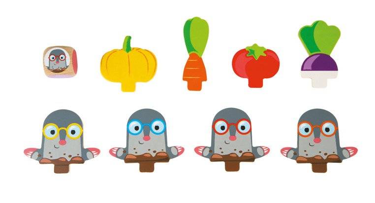 If a player rolls a picture of a mole, he must place his mole in any space on his stand. As long as the player has the mole in the basket, he cannot pick up any new vegetables. In order to be able to get rid of the pest, in the next round (or the next one), he must throw the picture of the mole on the dice again - then the animal returns to the corner of the board and the player can collect crops again.