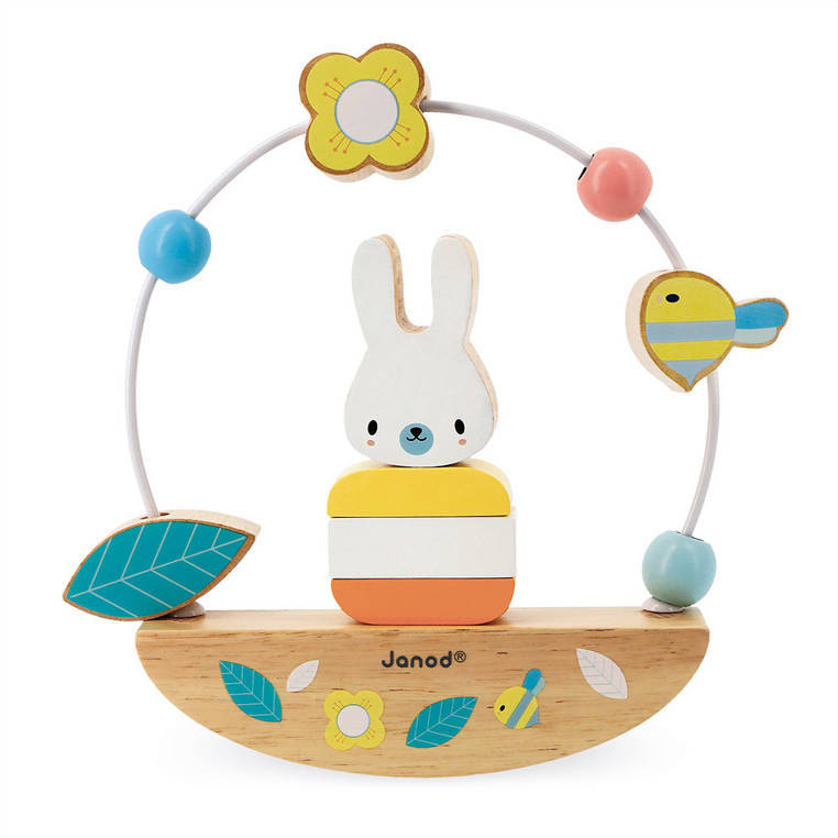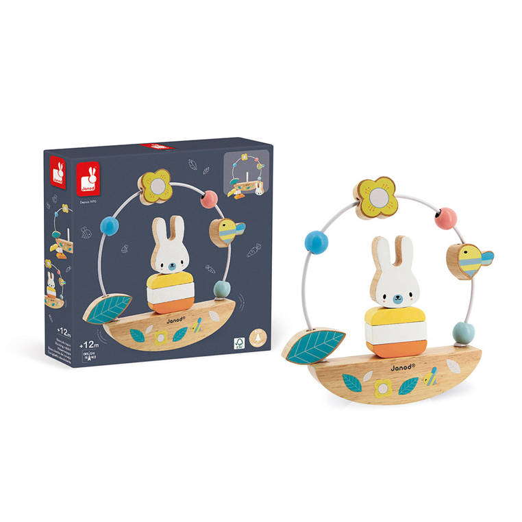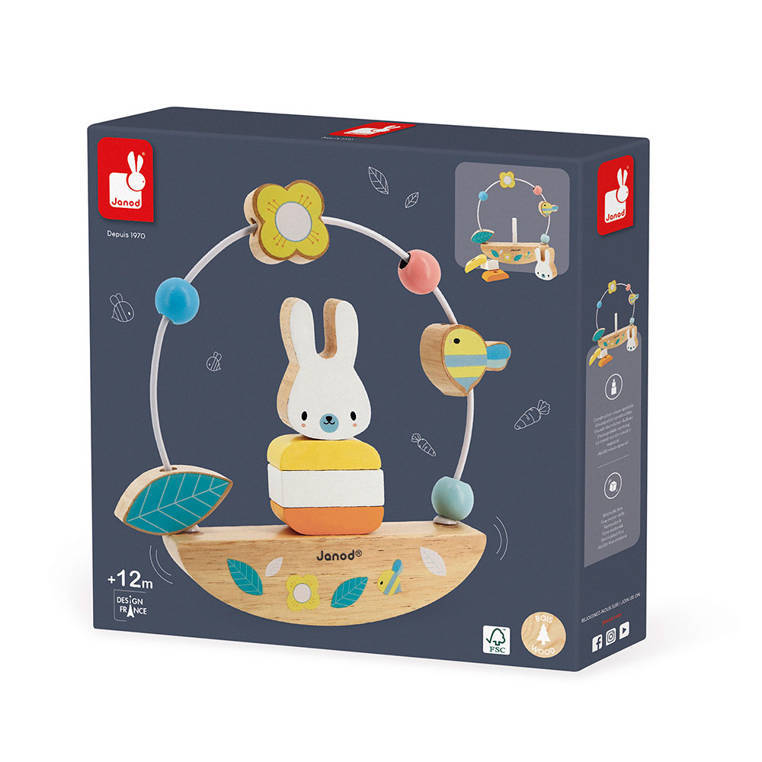 A wooden balance with an educational loop Bunny of the French brand JANOD is an ideal toy for children from 1 year of age. The toy, made of wood and metal, is placed on a semi-circular base that sway slightly. In its center there is a bunny-pyramid, composed of 4 elements, and around it a white loop with 6 elements to move: 3 beads, a leaf, a flower and a bee. Moving the blocks around the loop, arranging the pyramid and keeping the toy in balance develops motor coordination and the so-called fine motor skills. Various activities will prevent the toy from getting bored quickly, and the beautiful colors and friendly characters will additionally interest and encourage the child to play. All elements are easy to hold in little hands.