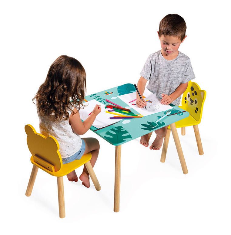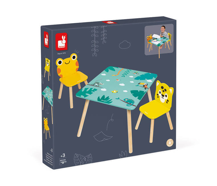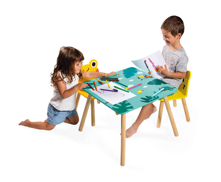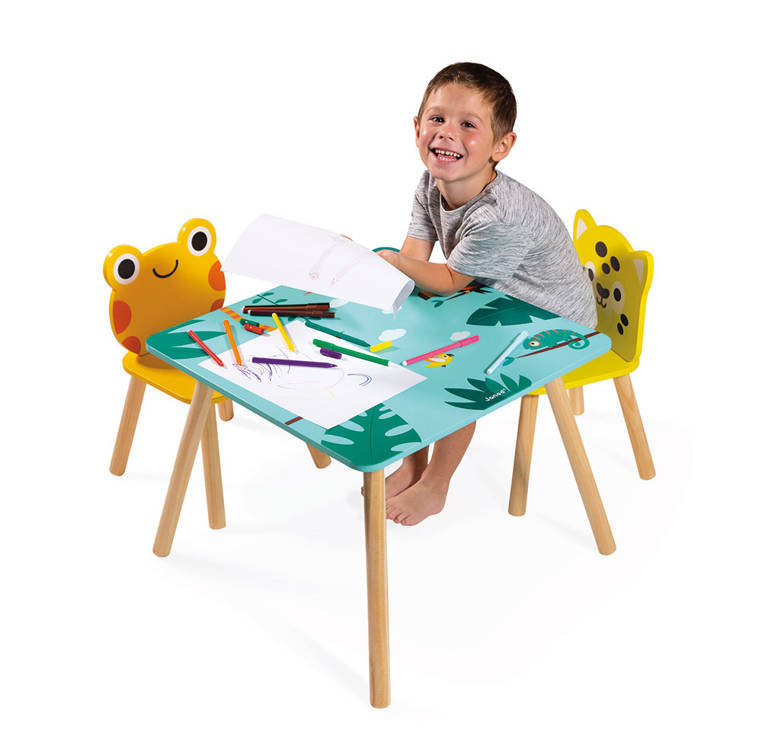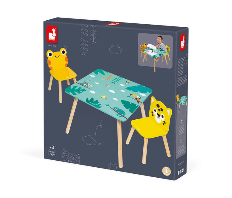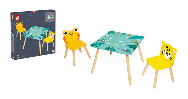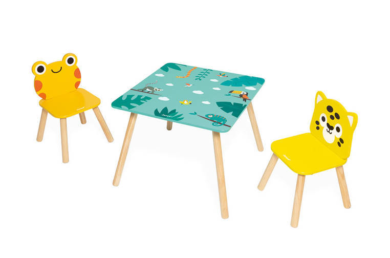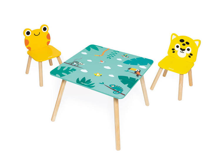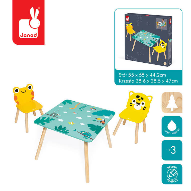 A wooden table and 2 chairs from the Tropic series by the French brand JANOD are beautiful and practical pieces of furniture for a child's room. The table is square (55 x 55 cm) with rounded corners, has a turquoise top with energizing tropical motifs and four legs in a natural shade of wood. The chairs also have light wooden legs, oval shapes that are safe for toddlers and wide, comfortable seats. One is orange with a frog-shaped backrest, the other is bright yellow with a jaguar's head. The furniture is solid, stable and height adjusted to children from 3 to 6 years old (the table top is 44 cm high). It is an exceptionally aesthetic, but also functional set that will add charm to a toddler's space.
