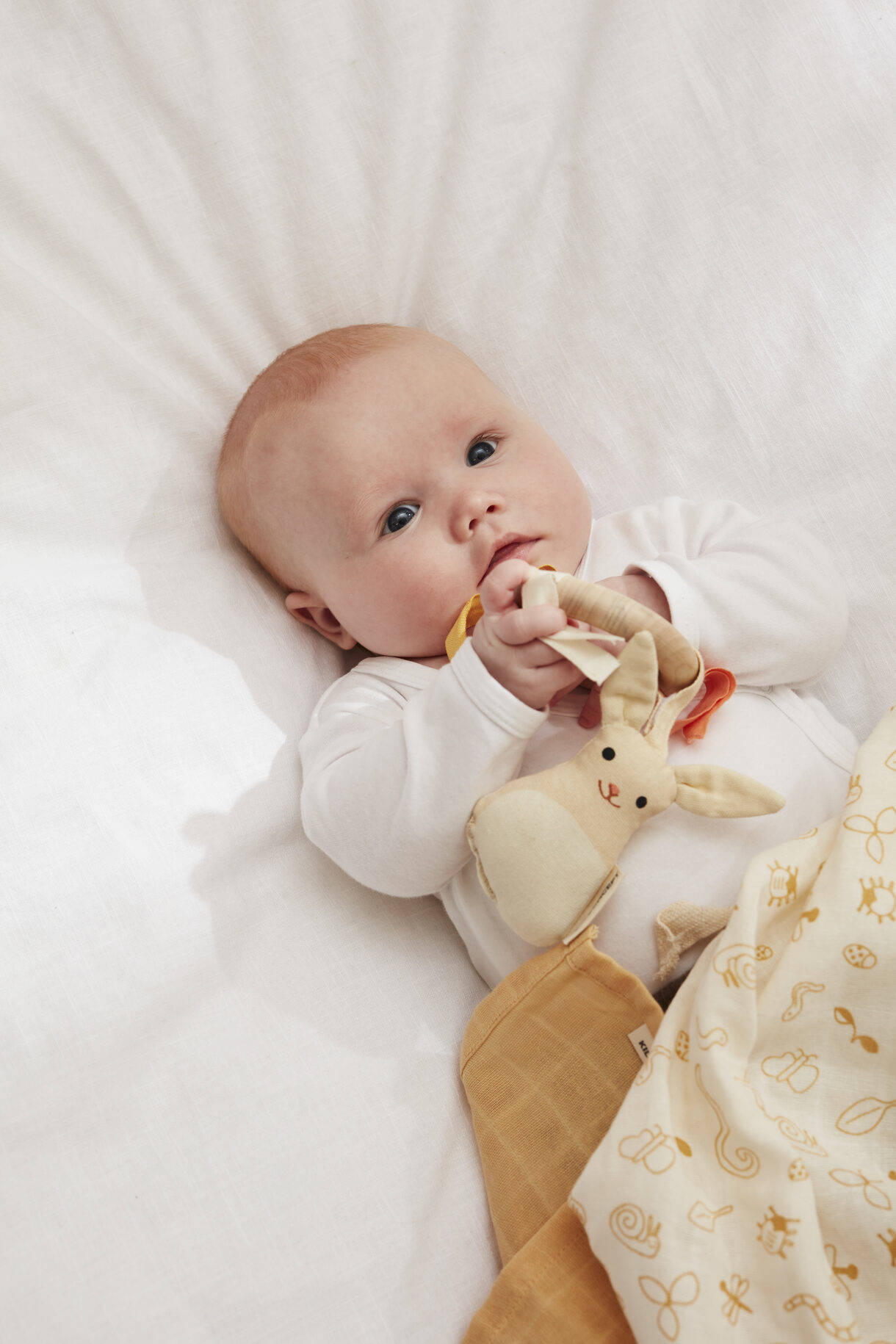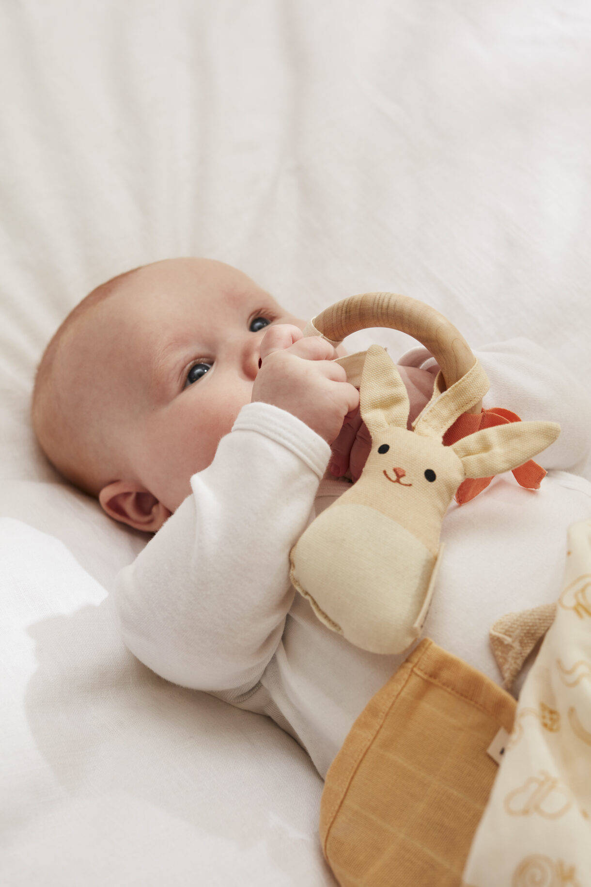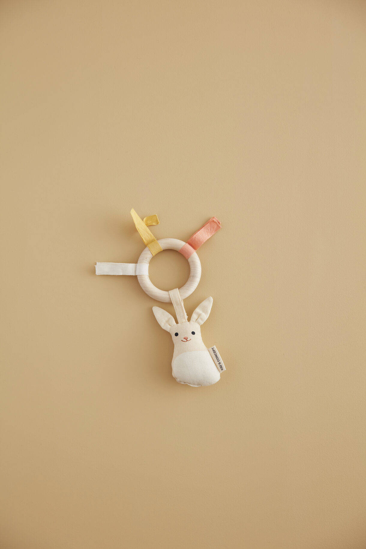 Easy to remove the small soft toy with the velcro attached and tag her along for the ride . A wooden bite, grip, and activity ring in FSC certified beech where rabbit Lu hangs together through textile ribbons, designed to entertain and stimulate baby's sensory skills. Different tactile surfaces activate the baby's tactile senses. Easy to remove the rabbit with the Velcro attached and tag her along for a ride somewhere else, for example to the pram, to the changing table or to use as a soft toy. The activity ring is a great toy when the baby starts to grip and likes to feel different surfaces and starts to discover things on its own.