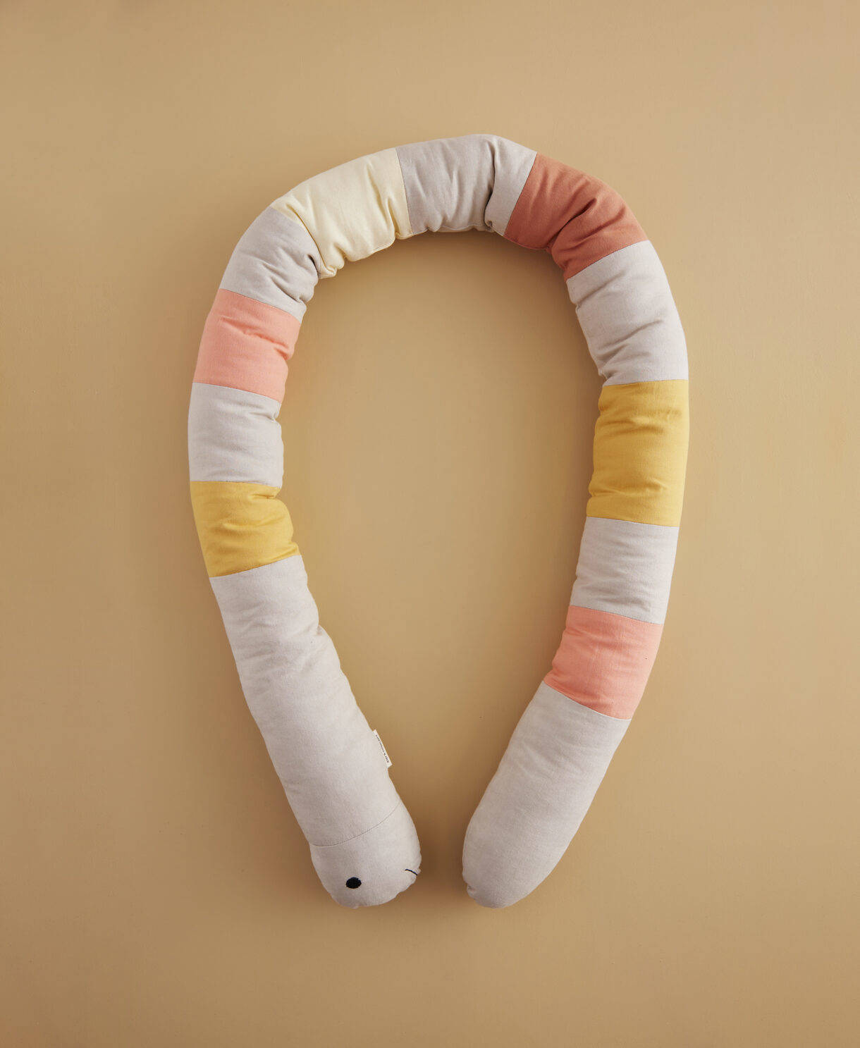 It can work as a cuddly long soft toy or a cozy sleeping nest for the baby. Use it for infants as a soft and cozy cot “lining” to make it softer, cuddlier and a safer cozy place inside the crib or a cot. Use it as an armrest support during breastfeeding, bottle feeding or as a pregnancy pillow. The long pillow can be arranged in a circle or whatever suits the occasion. When the child gets bigger, it can be used as a safe and cuddly soft toy on the sofa or in bed. Use as a soft protection and support when the child gets a larger bed and perhaps when the child falls asleep in the car.
