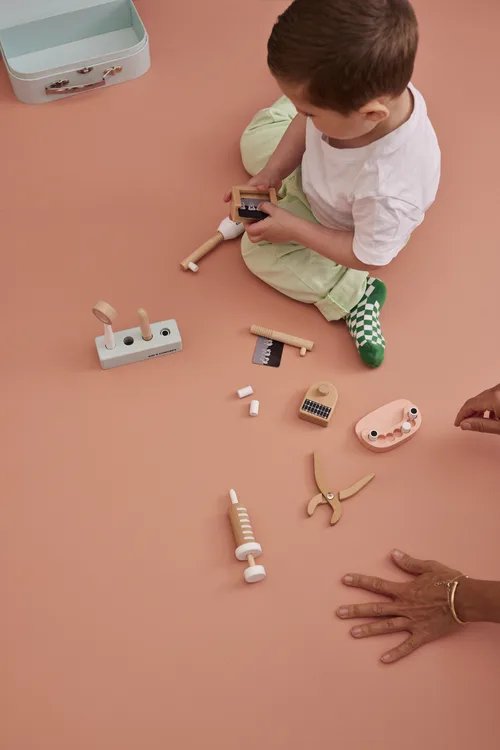 Bag: cardboard. Handle bag: stainless steel. Syringe, Bruch, drill, polish head, mirror handle, teeth: birch. Mirror: acrylic. Gum: plywood. Piler, X-ray machine: beech. X-ray plates: paper. Tool stand: MDF.