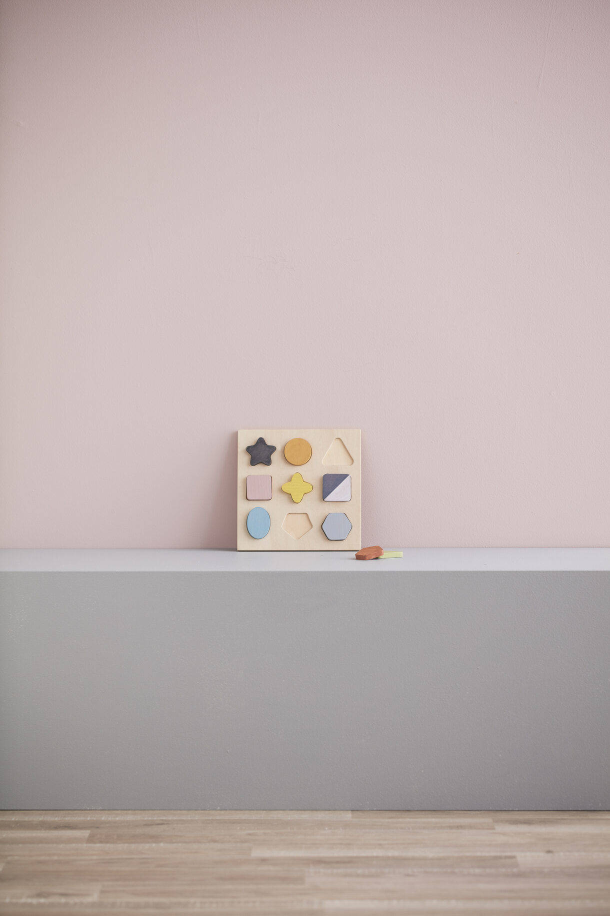 9-piece puzzle, made of pine wood, with different geometric shapes in gentle pastel colors.