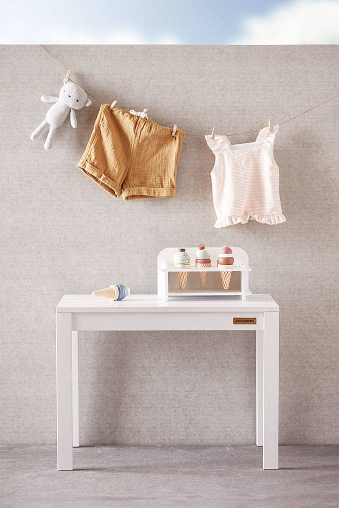 The rack is white and soft-colored and the ice creams are designed to look like different ice cream flavors. Perfect to sell in the pretend store.