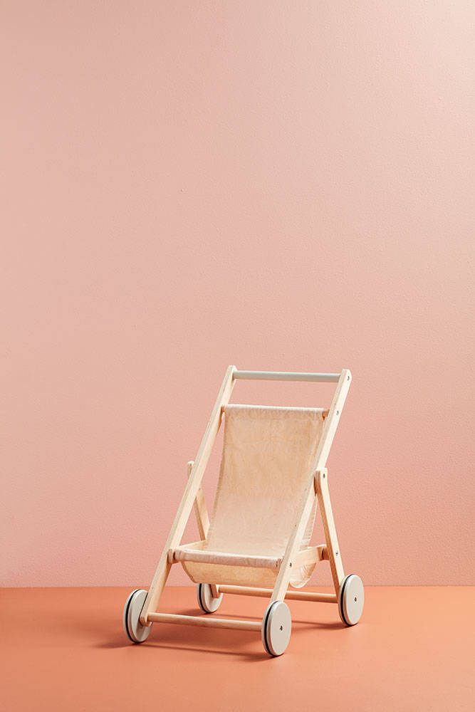 The stroller has cute green wheels and a small pocket at the back, and under the seat there is additional storage for everything you need to care for your doll and soft toys. It was made primarily of unbleached cotton and linden plywood. Both Teddy and Dolly will sit comfortably on all your trips.