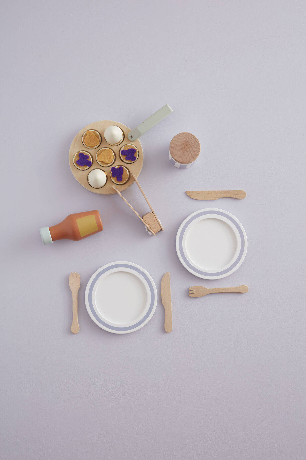 - Frying pan: plywood Jam jar lid, kitchen utensils: birch Whipped cream portions, bottle: schima Plates, pancakes: MDF Jam portions: polyester