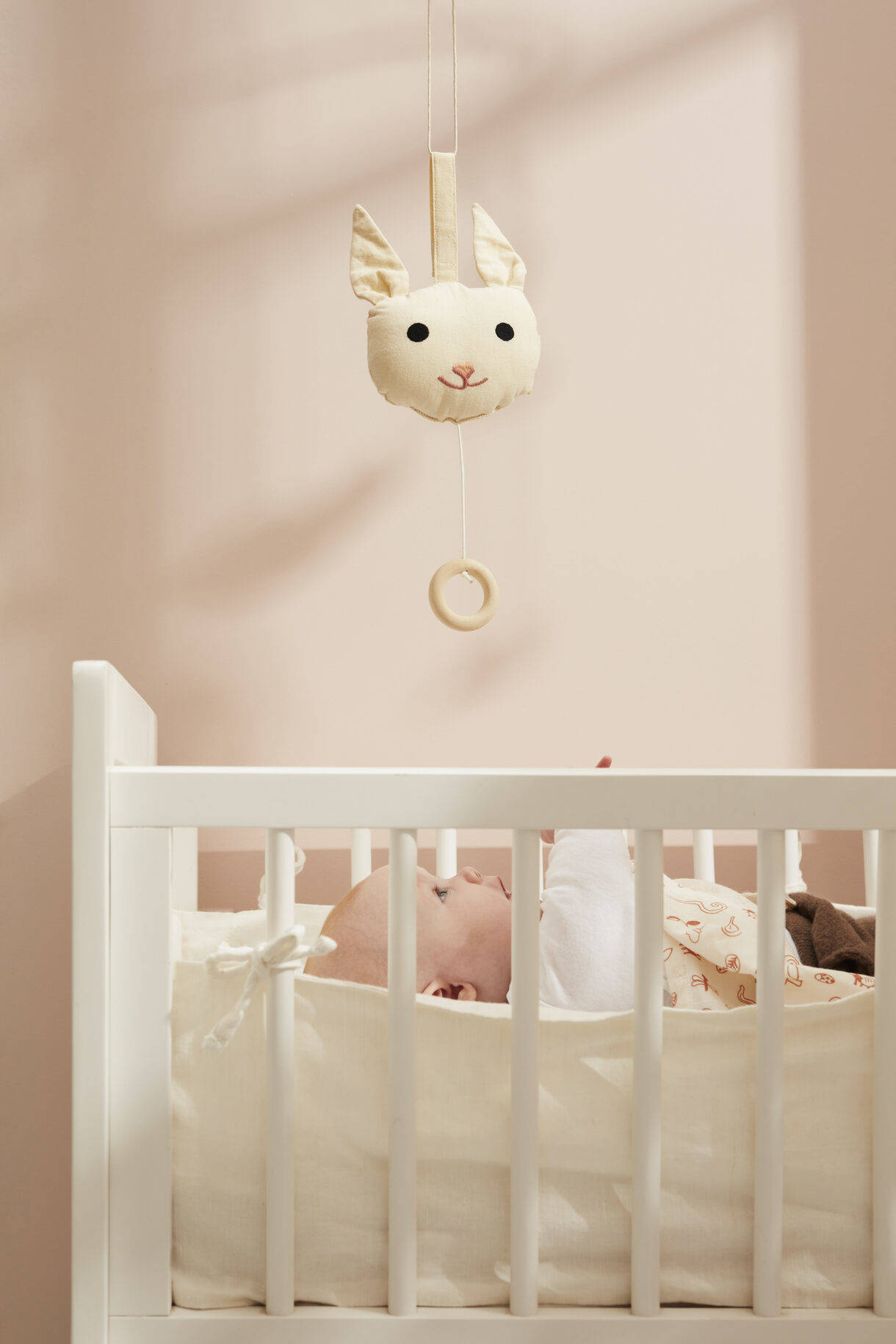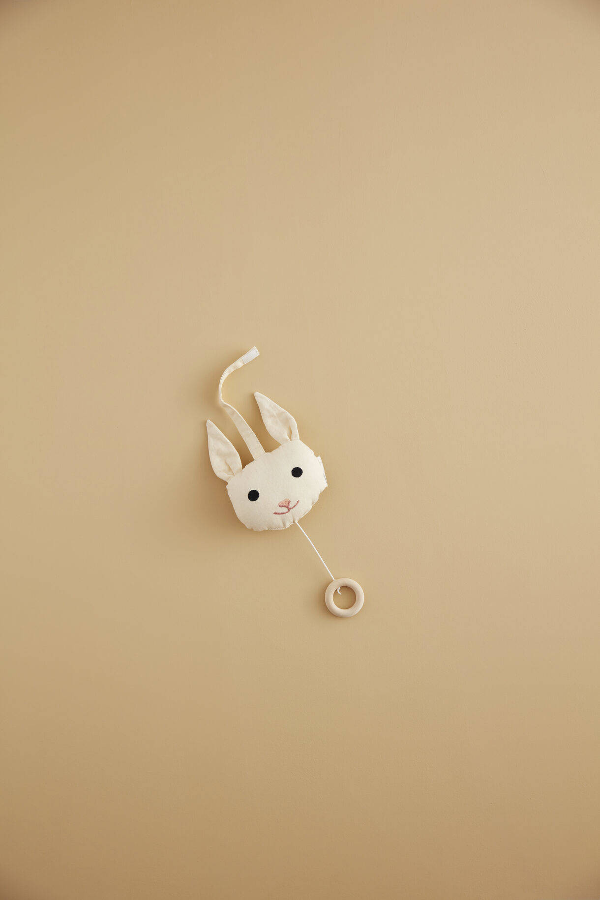 Pull the wooden ring and Lu the rabbit is ready to play a comforting melody for your baby. It can provide a sense of security for the baby to hear the same melody being played. Velcro strings for hanging makes it easy to move. Keep your little one amused when changing nappies. Hang it in the stroller or by the car seat. Clean with a damp cloth or dust clean the fabric. As the music box contains mechanical parts, it cannot be washed in a washing machine or soaked.