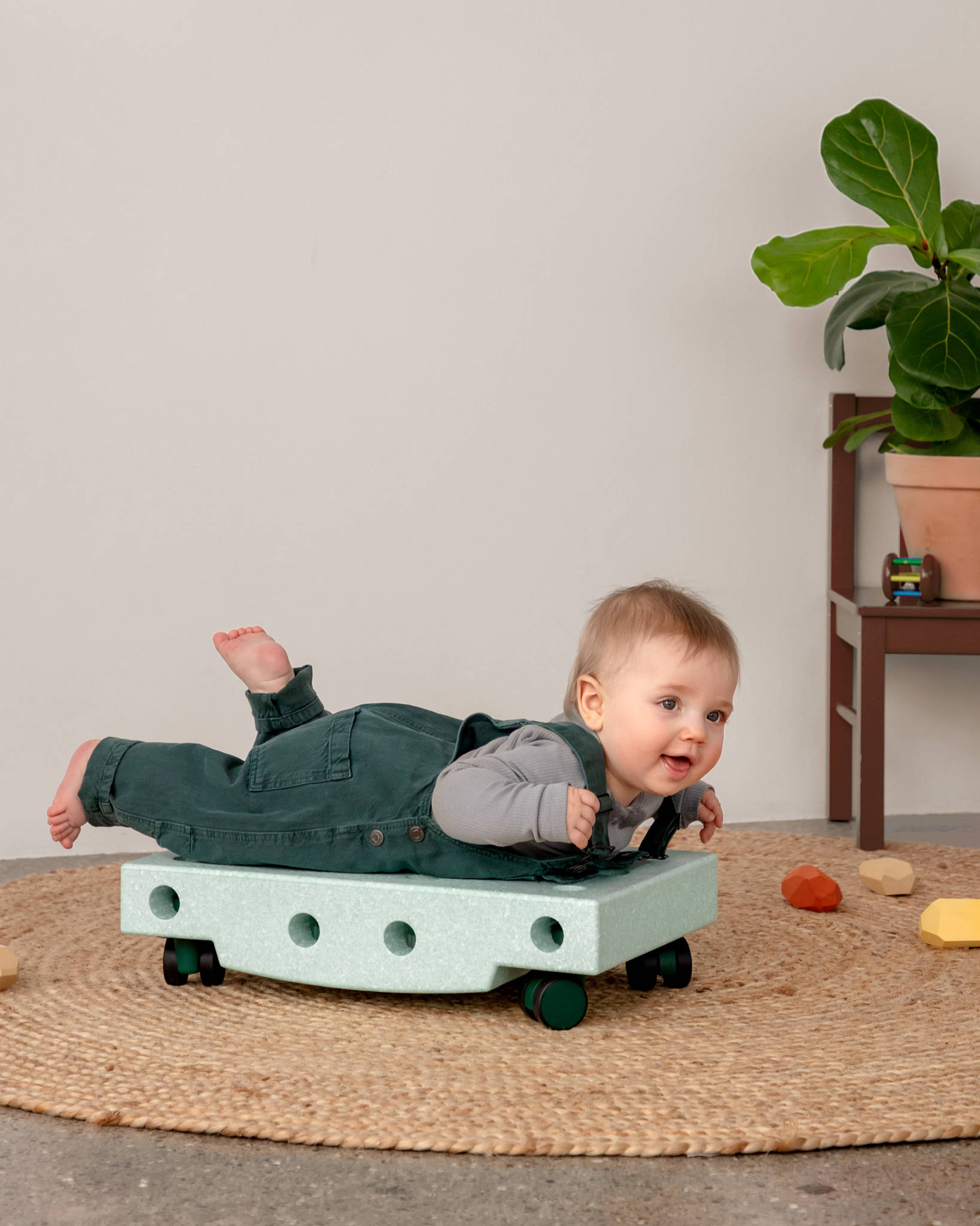 This MODU Scooter Board is a simple yet versatile toy for practicing basic motor skills with your baby or toddler. Use it for tummy time and move the board around, or remove the wheels and rock back and forth. Even simple movements and sensory stimulation can bring a smile to a baby's face — and the fun has just begun! As your kids grow, let them enjoy the freedom of spinning around on their own, using their entire body. Remove the wheels and you've got yourself a balance board or combine with the rest of the MODU system to build more advanced creations.