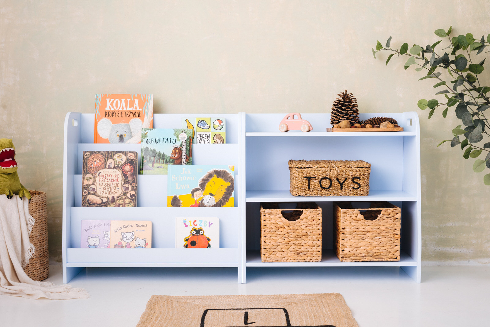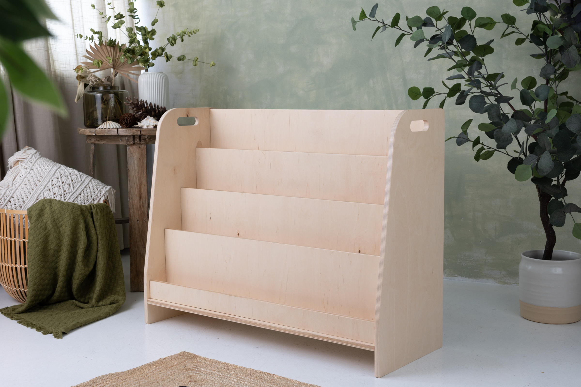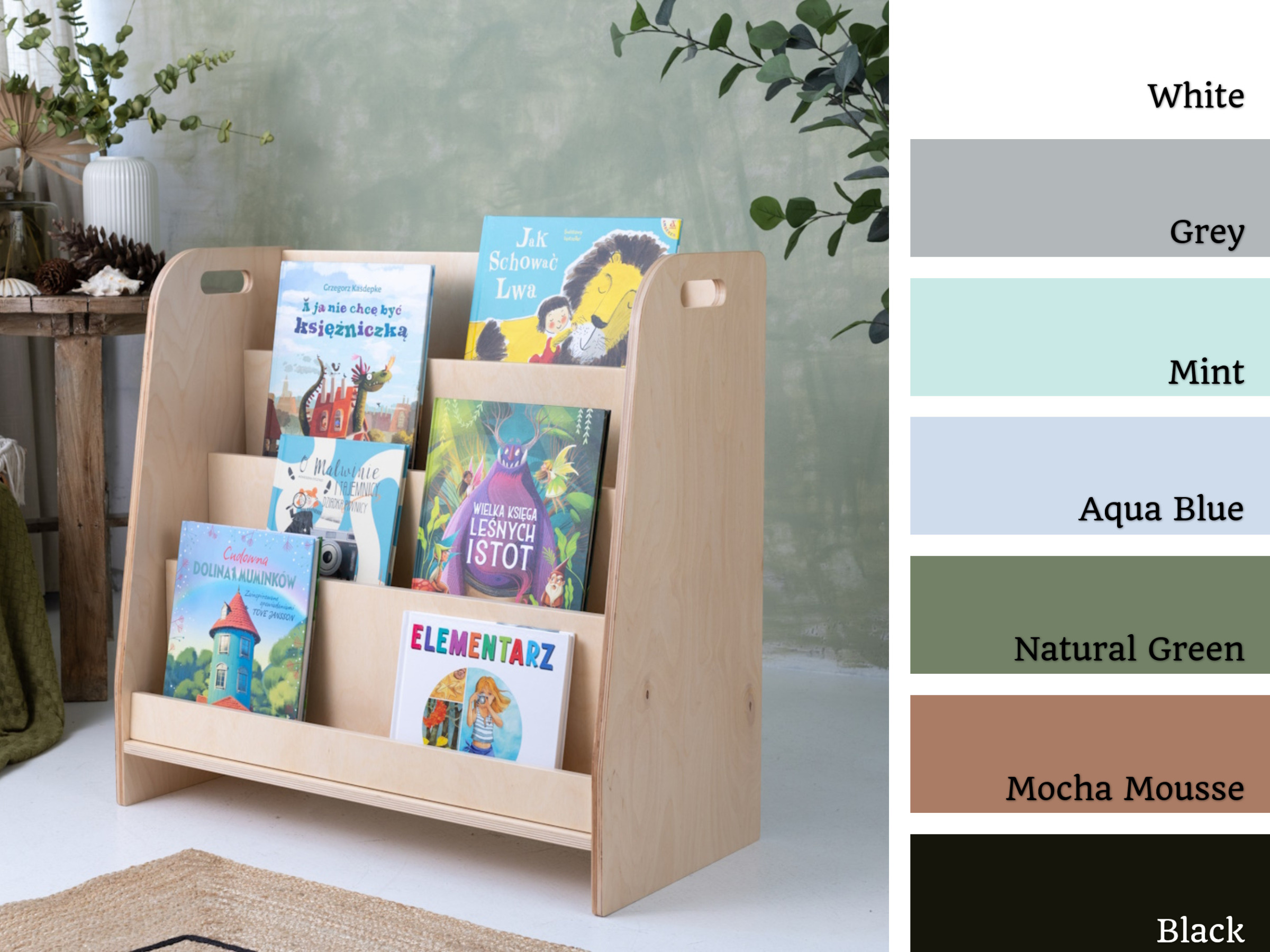 The children’s bookshelf is handcrafted from 15mm thick plywood made from hardwood. It has been painted with environmentally friendly and child-safe coatings and paints, meeting the requirements of the European standard PN EN 71.3.