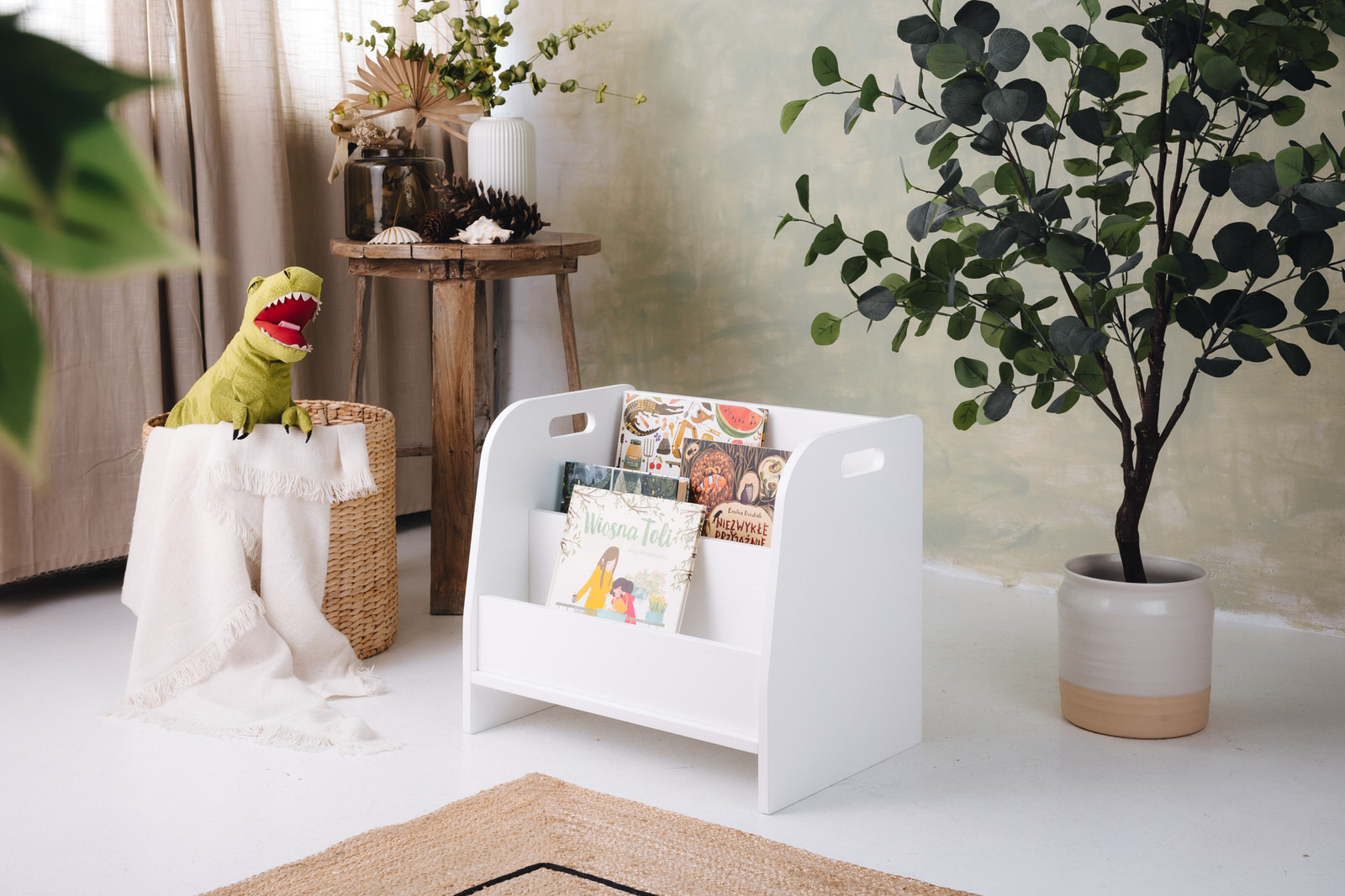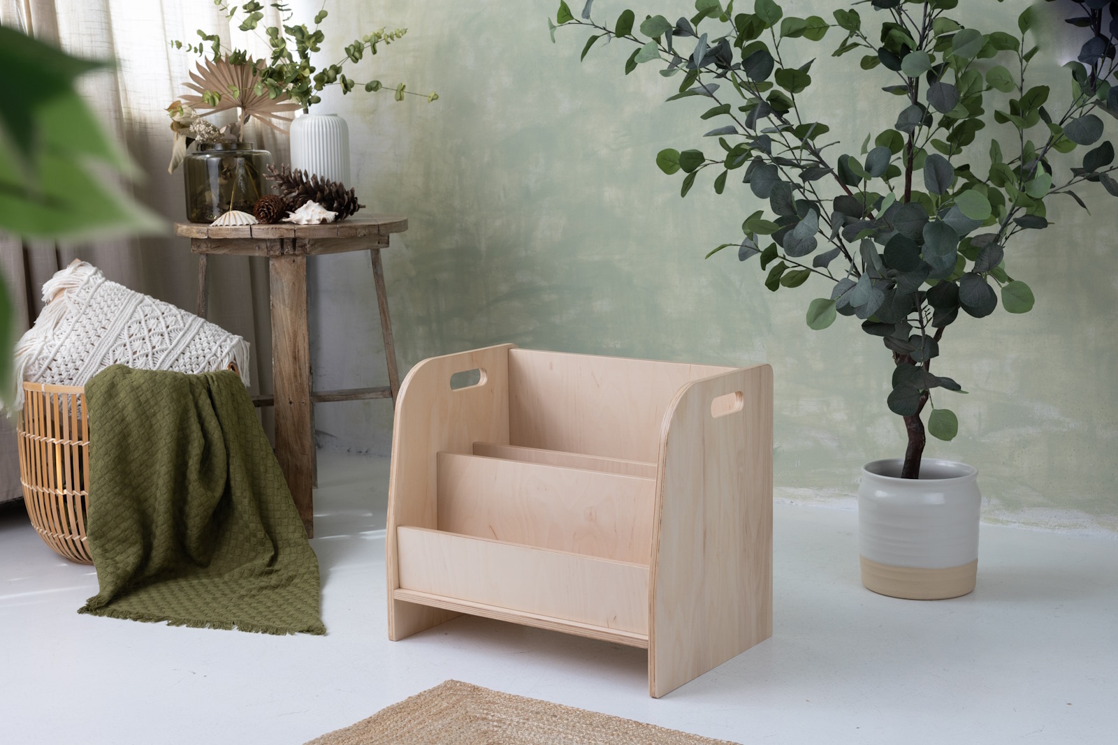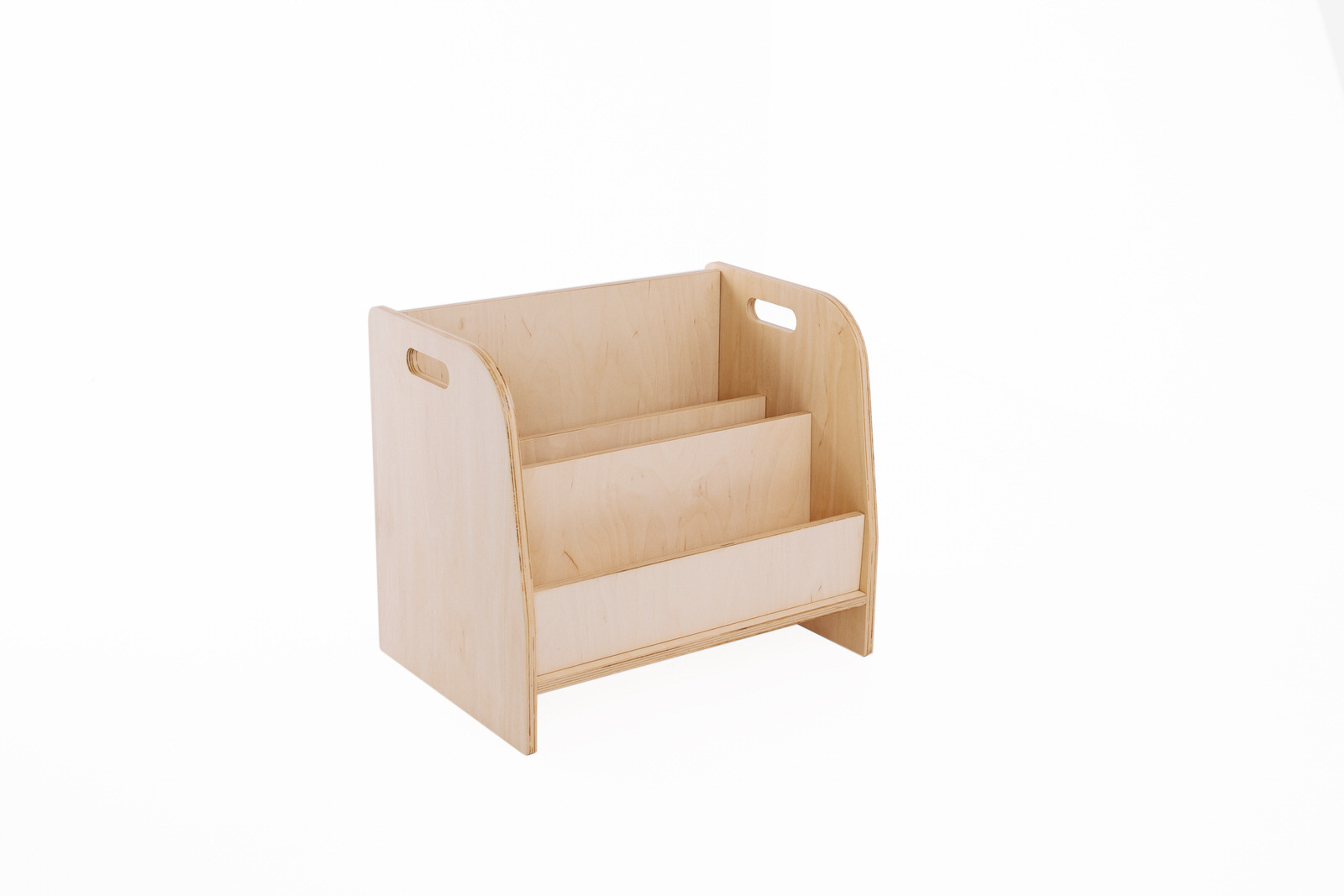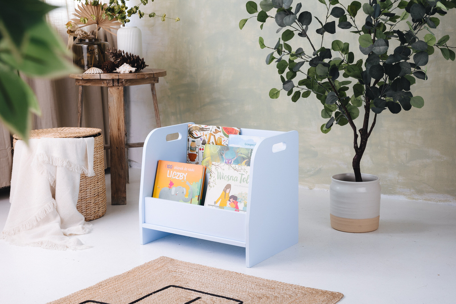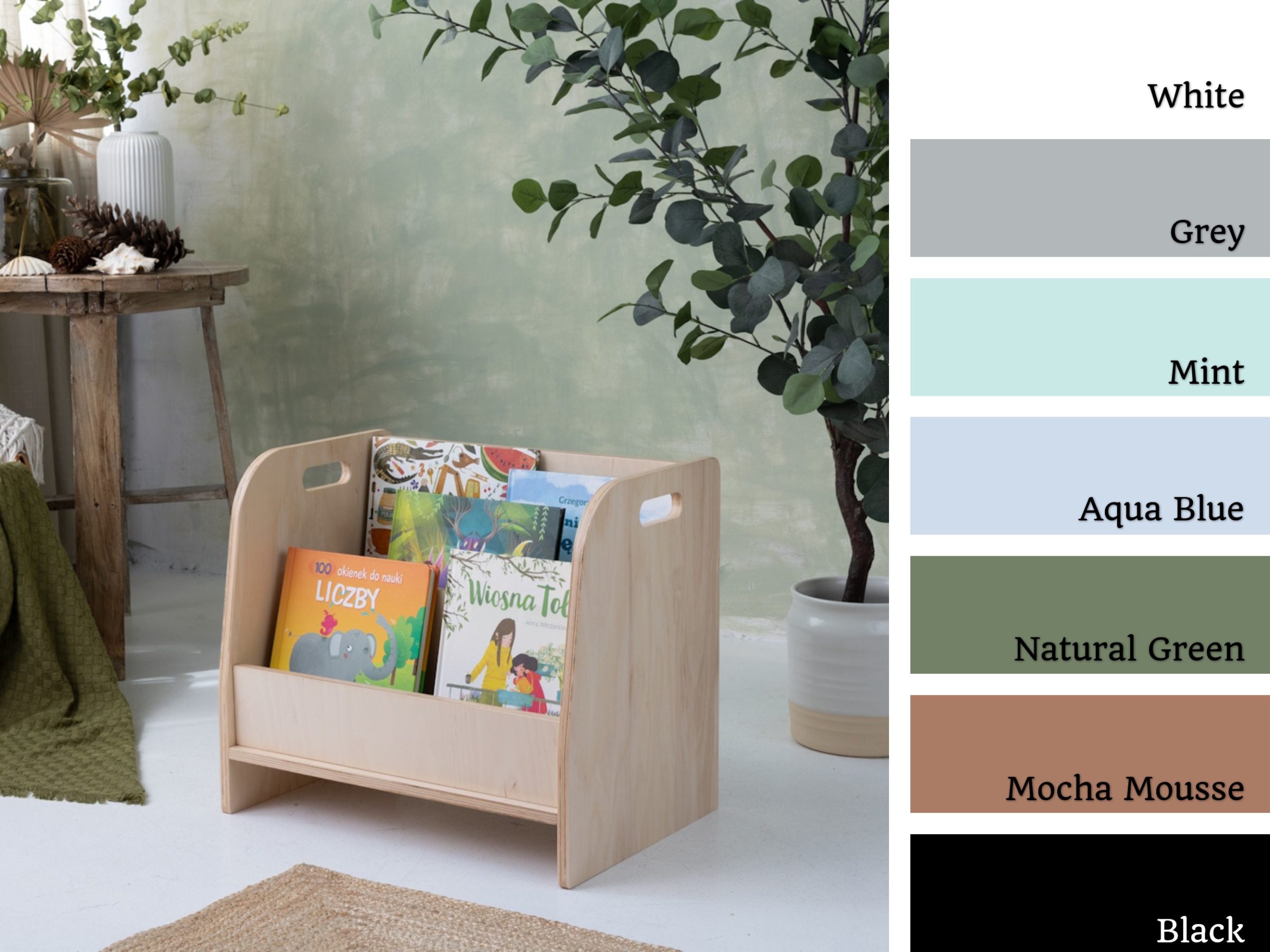 The children’s bookshelf is handcrafted from 15mm thick plywood made from hardwood. It has been painted with environmentally friendly and child-safe coatings and paints, meeting the requirements of the European standard PN EN 71.3.