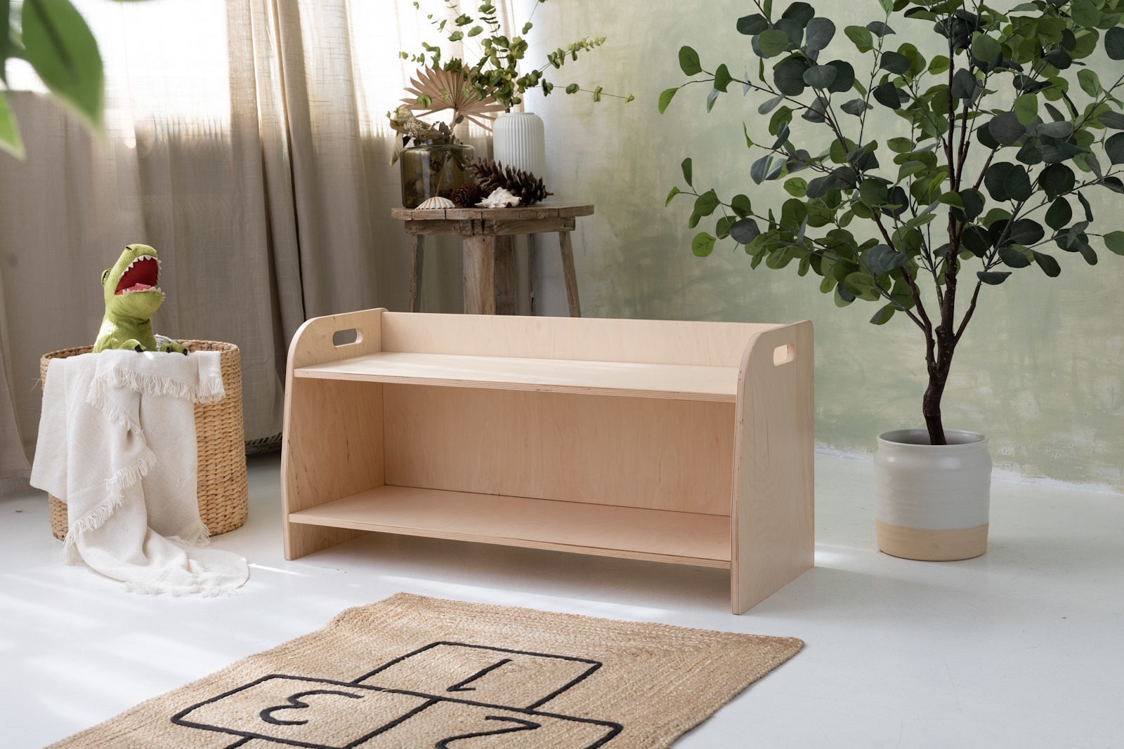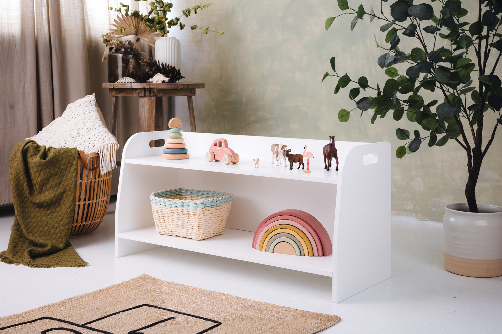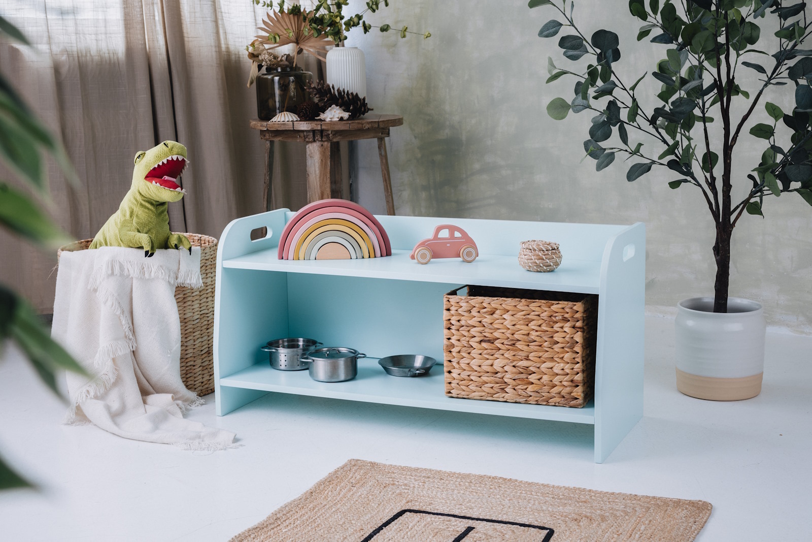 The toy shelf has two shelves that the child has unlimited access to. The furniture stands directly on the floor and measures only44cm in height.