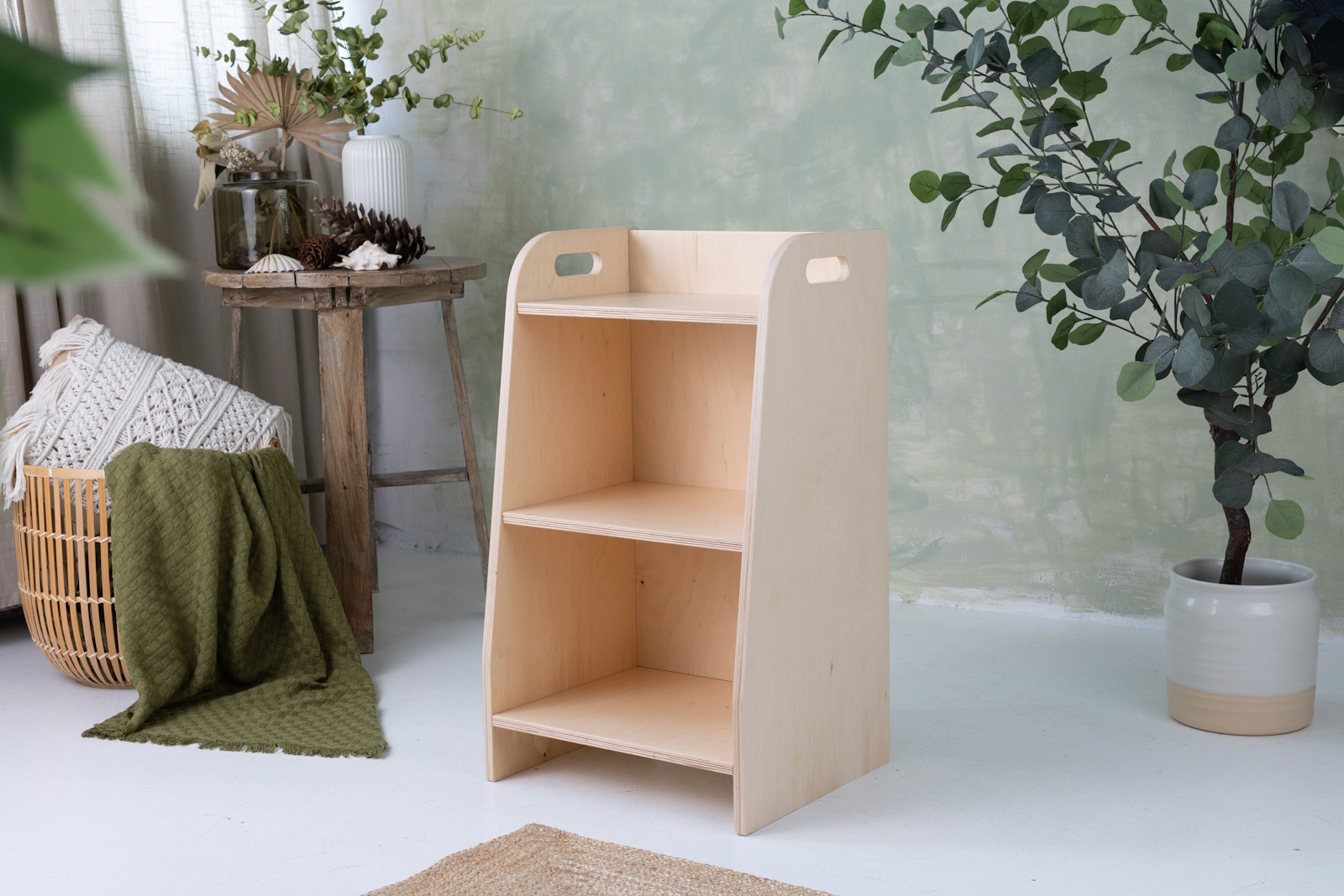 The toy shelf has three shelves that the child has unlimited access to. The furniture stands directly on the floor and measures only 70cm in height.