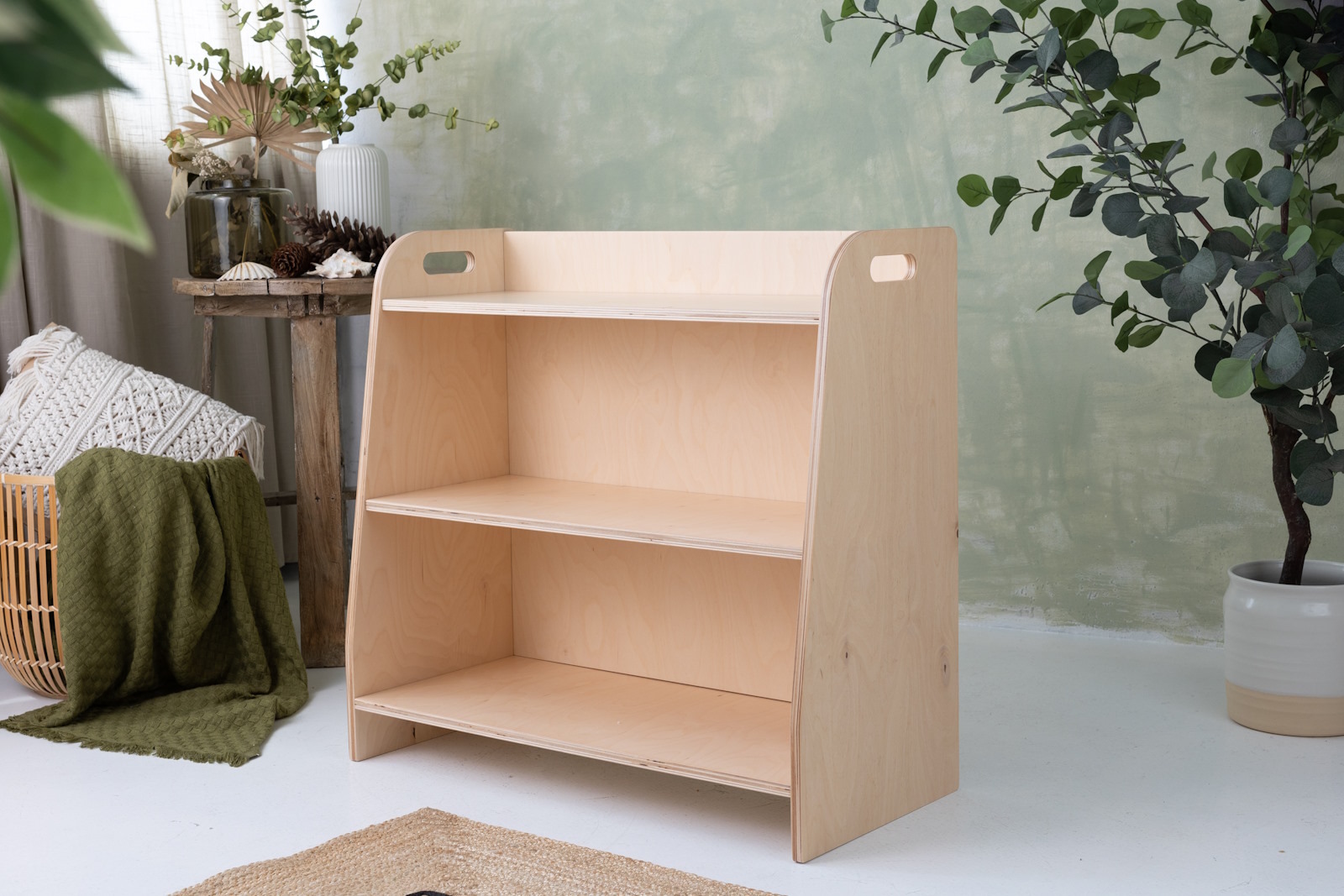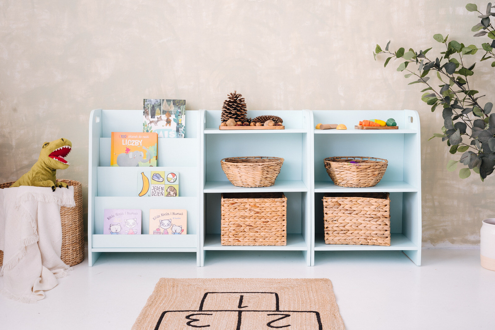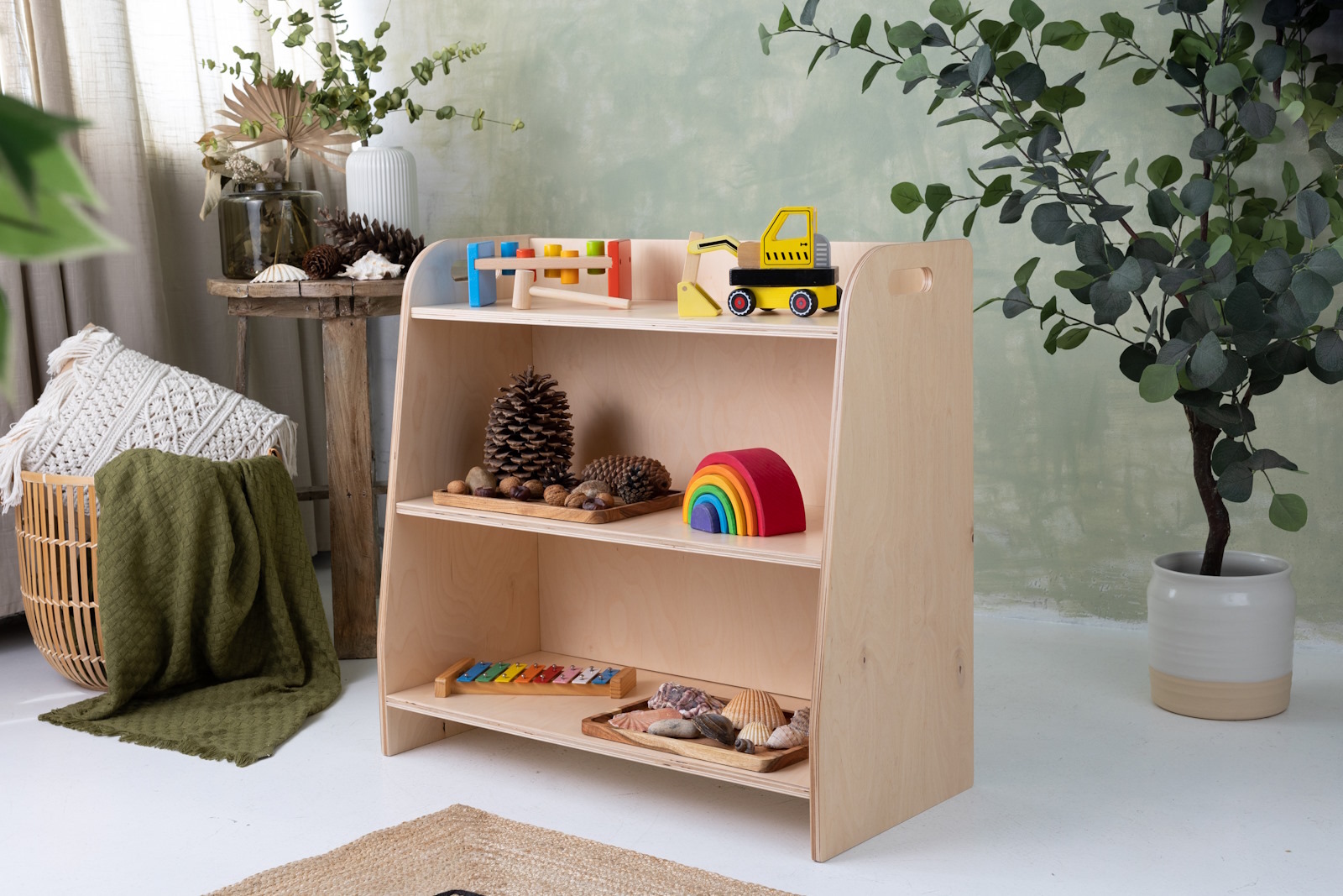 The toy shelf is handmade from 15mm thick plywood made from hardwood. It has been painted entirely with environmentally and child-safe paints and meets the requirements of the European standard PN EN 71.3, among others.