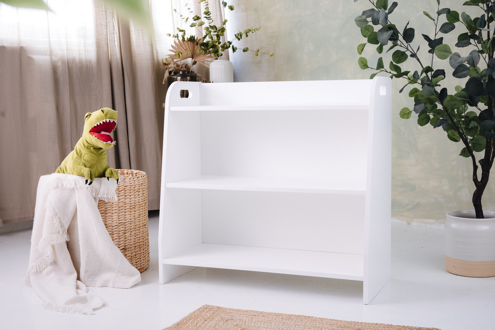 The toy shelf has three shelves that the child has unlimited access to. The furniture stands directly on the floor and measures only 70cm in height.