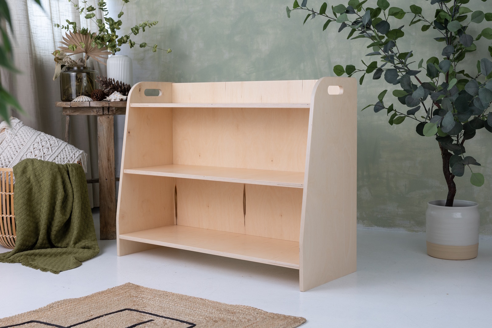 The toy shelf is handmade from 15mm thick plywood made from hardwood. It has been painted entirely with environmentally and child-safe paints and meets the requirements of the European standard PN EN 71.3, among others.