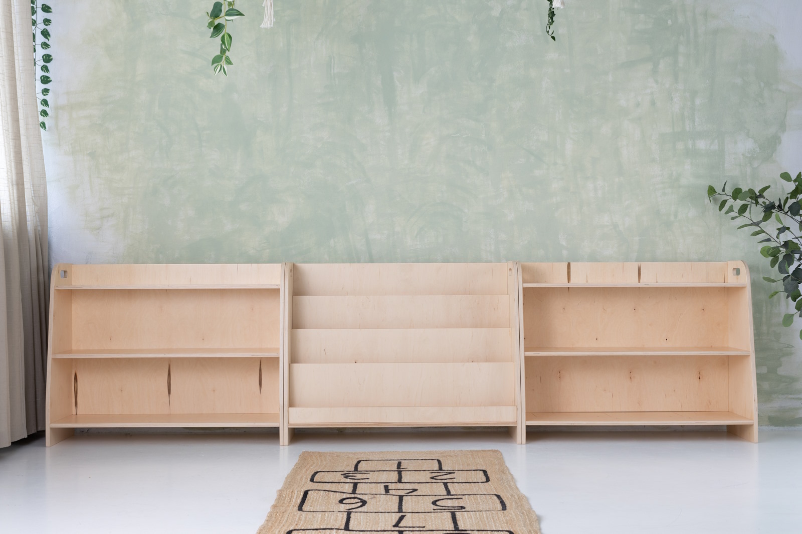 The toy shelf has three shelves that the child has unlimited access to. The furniture stands directly on the floor and measures only 70cm in height.