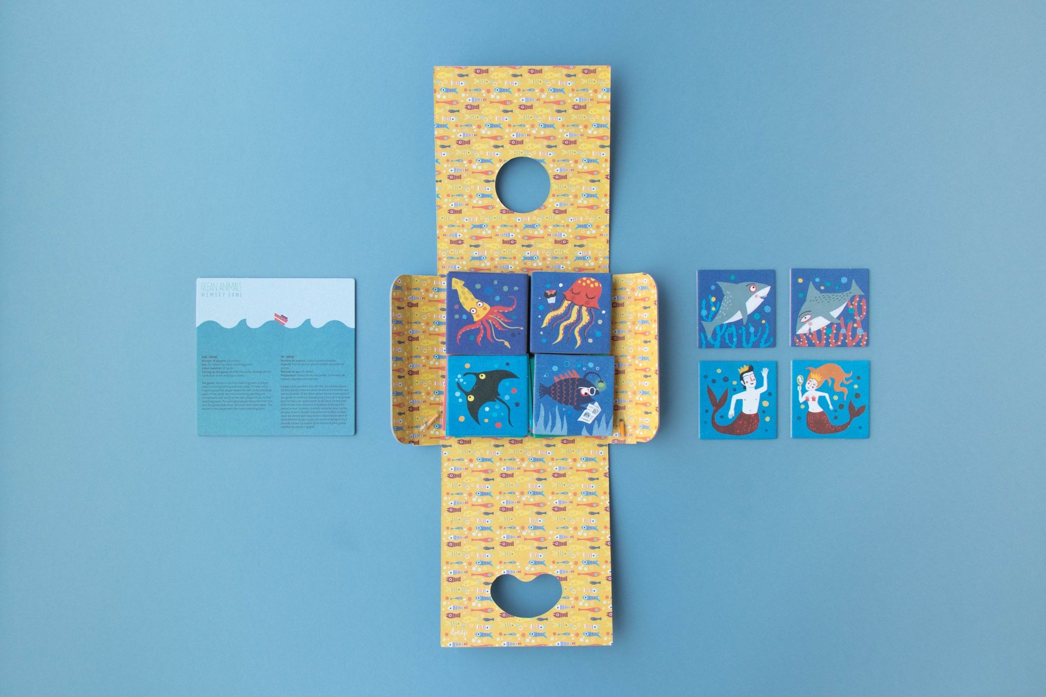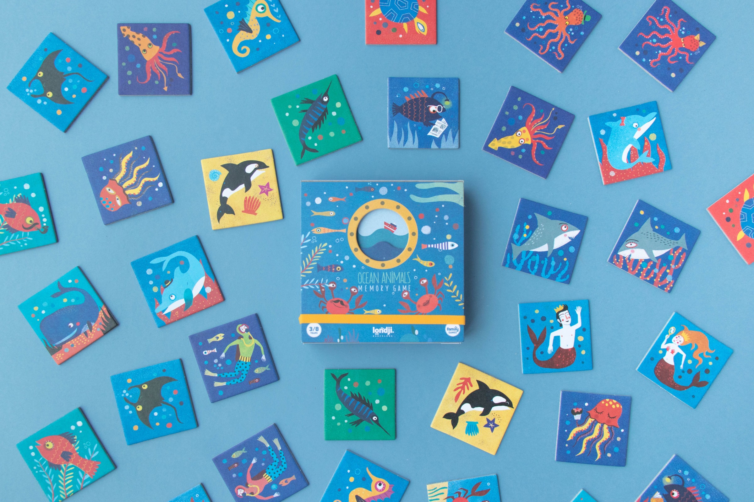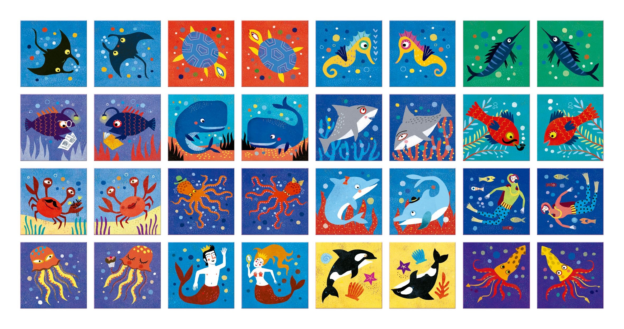 A sea animal memory game, with thirty two delicately illustrated pieces. A game with simple rules, ideal as a starter board games.