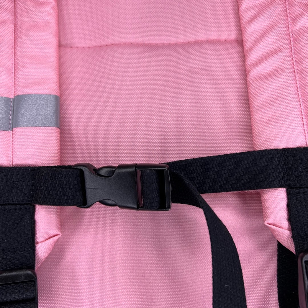 It is a single-compartment backpack with a small zipped pocket on the outside and mesh pockets for small items or a water bottle.Ā The interior is made of a waterproof solid lining.Ā Inside the kindergarten backpack there is a place with a removable label for signing.Ā The whole thing is fastened with a pink zipper, which was matched to the color of the backpack to make the whole thing original.Ā The kindergarten backpack uses a stiffening lining, which ensures that its shape will always be maintained.Ā The backpack has a reflective element, which improves safety when going to kindergarten.Ā The back and straps of the backpack are stiffened to take care of the child’s posture.Ā The straps are adjustable in length.Ā A girls’ kindergarten backpack with a giraffe on shoulder straps has a chest strap that relieves the burden on the little user’s back.Ā There is a handle at the top of the backpack.Ā All black straps used in the kindergarten backpack are cotton.