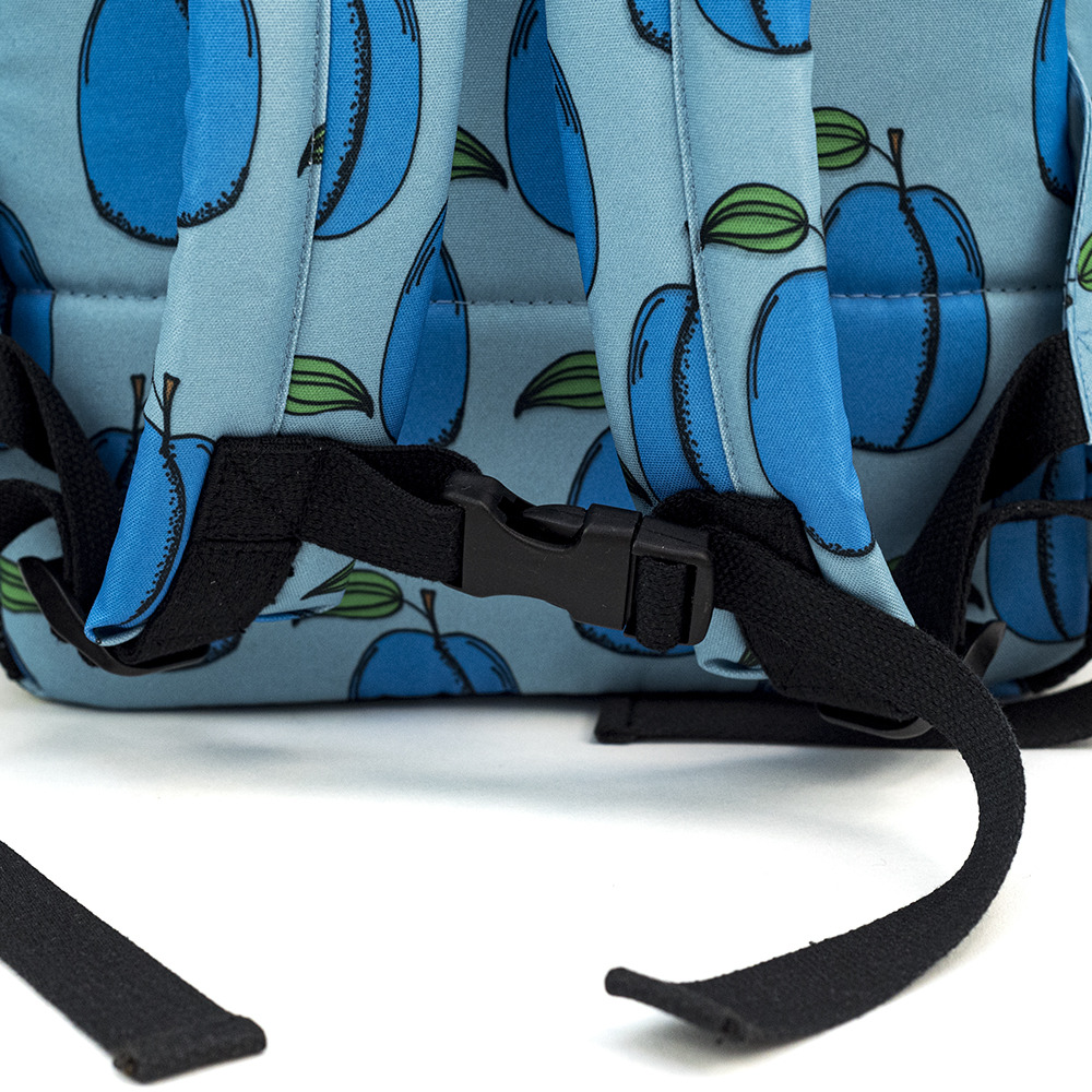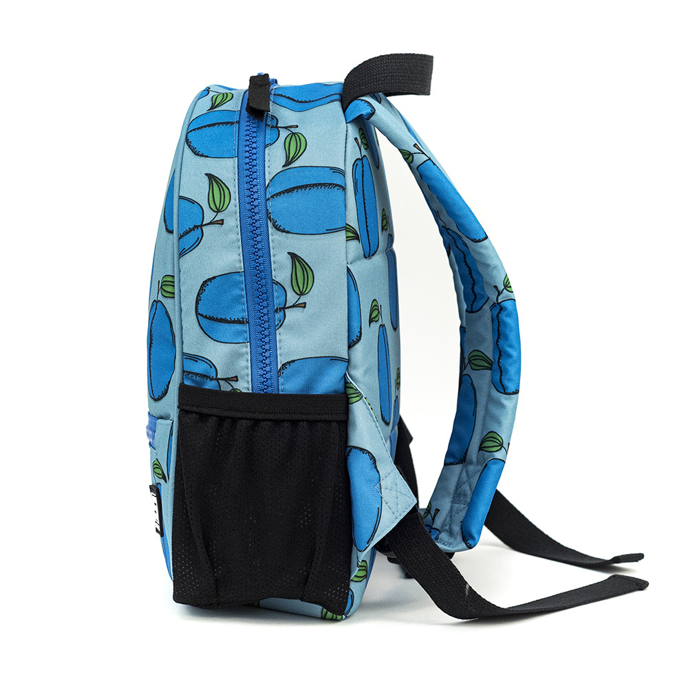 Mochila de jardĆn de infantes con ciruelas azules sobre fondo azul.