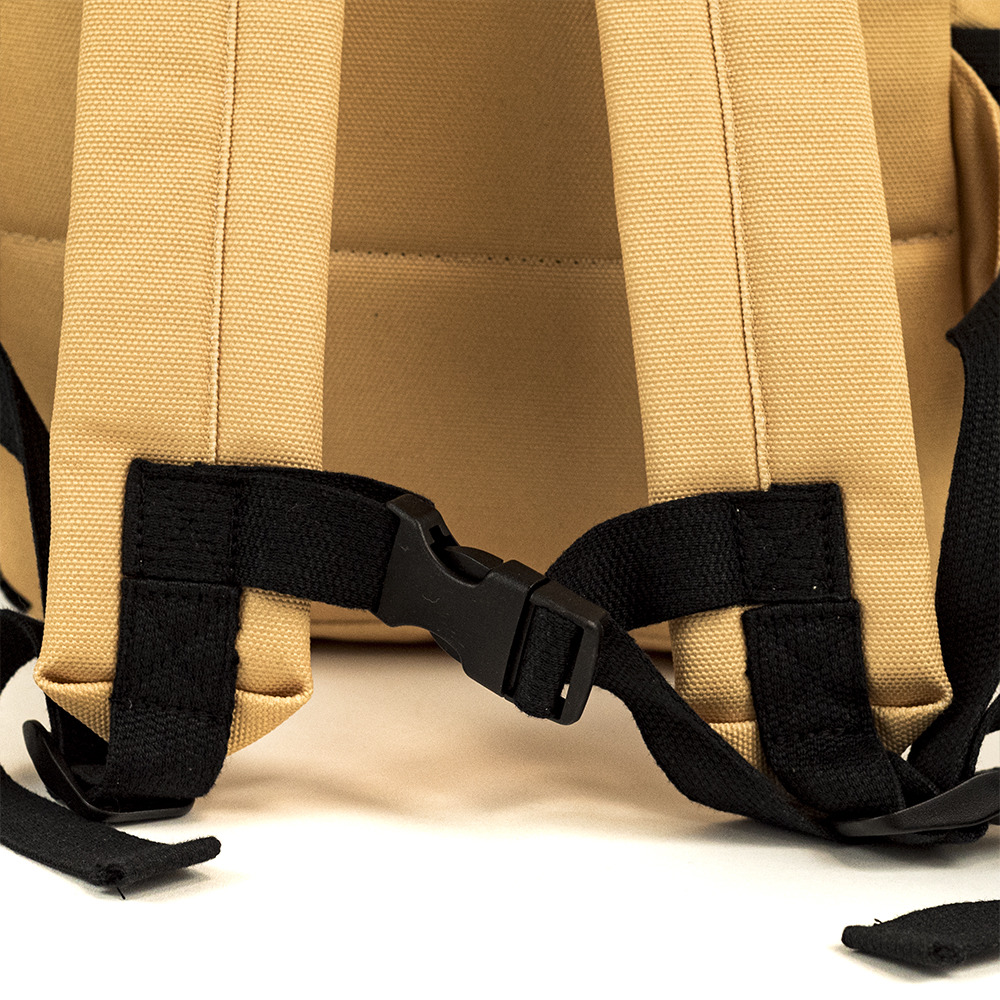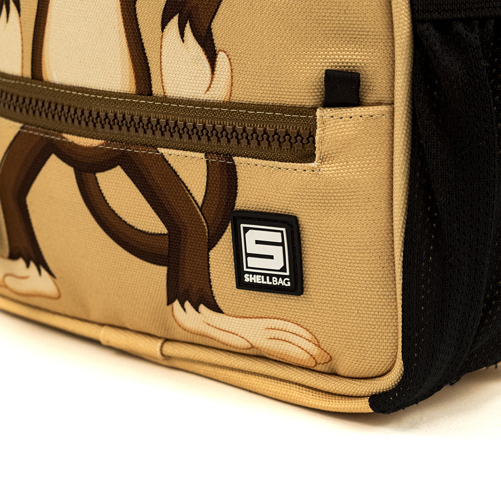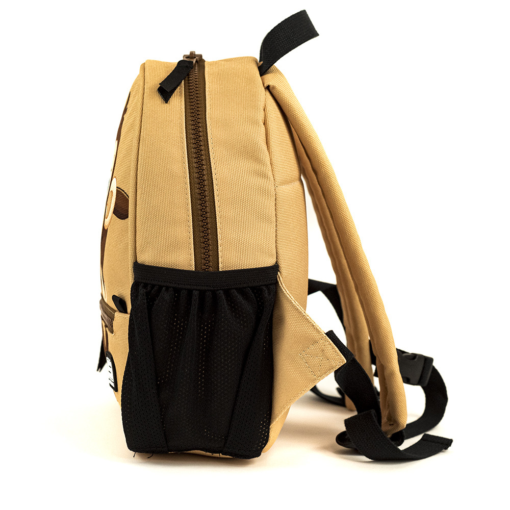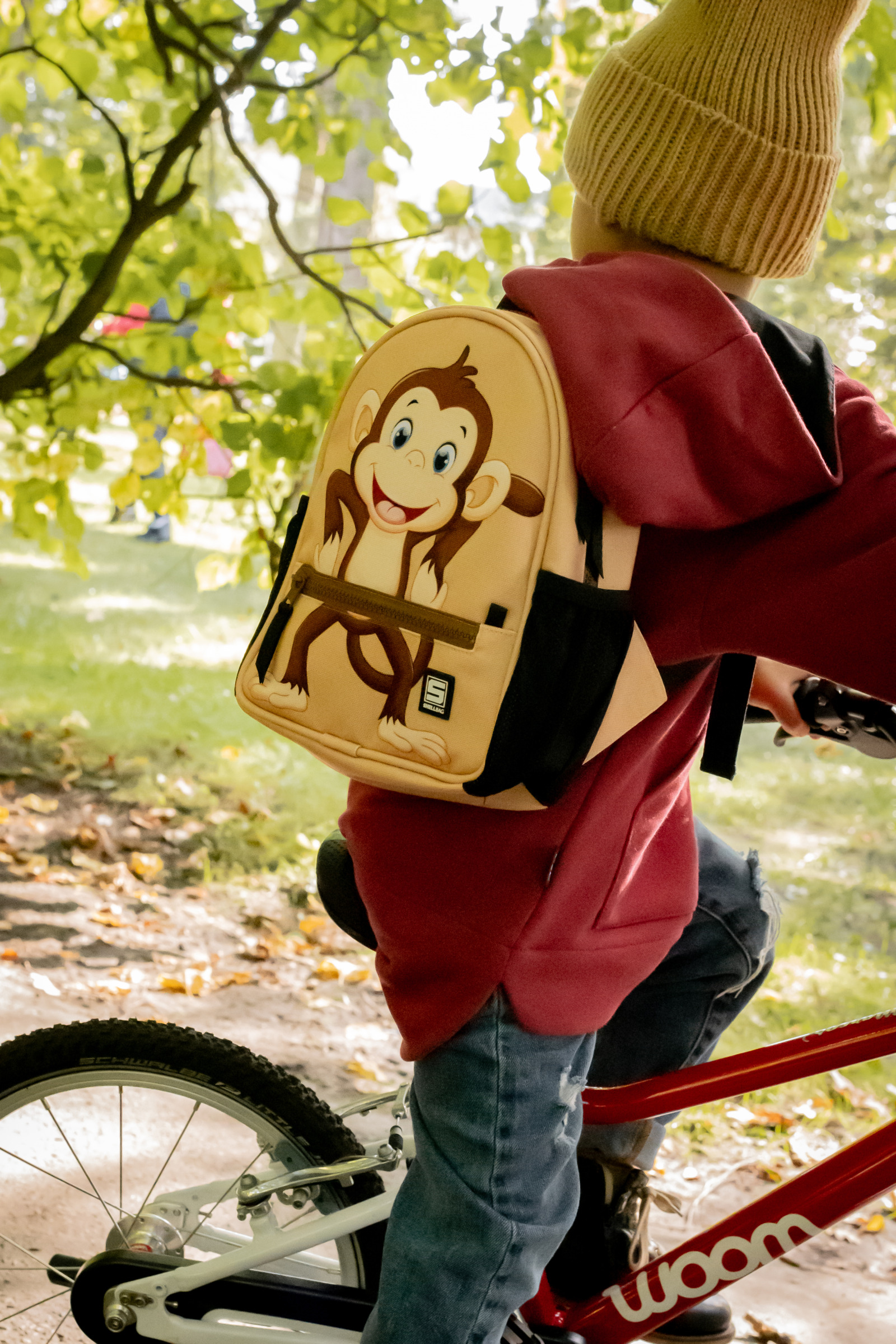It is a single-compartment backpack with a small zipped pocket on the outside and mesh pockets for small items or a water bottle.Ā The interior is made of a waterproof solid lining.Ā Inside the kindergarten backpack there is a place with a removable label for signing.Ā The whole thing is fastened with a brown zipper, which was matched to the graphics, primarily to give the whole thing originality and contrast.Ā The kindergarten backpack uses a stiffening lining, which ensures that its shape will always be maintained.Ā The backpack has a reflective element, which improves safety when going to kindergarten.Ā The back and straps of the backpack are stiffened to ensure the correct posture of the child.Ā The straps are adjustable in length.Ā A children’s kindergarten backpack with a monkey on suspenders has a chest strap that relieves the back of the little user.Ā There is a handle at the top of the backpack.Ā All black straps used in the kindergarten backpack are cotton.