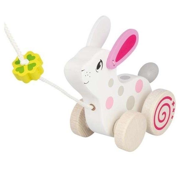 With an appetizing clover leaf in front of its nose, the charming wooden rabbit is ready to follow its benefactor eagerly every step of the way. The modern design should attract the attention of many children.