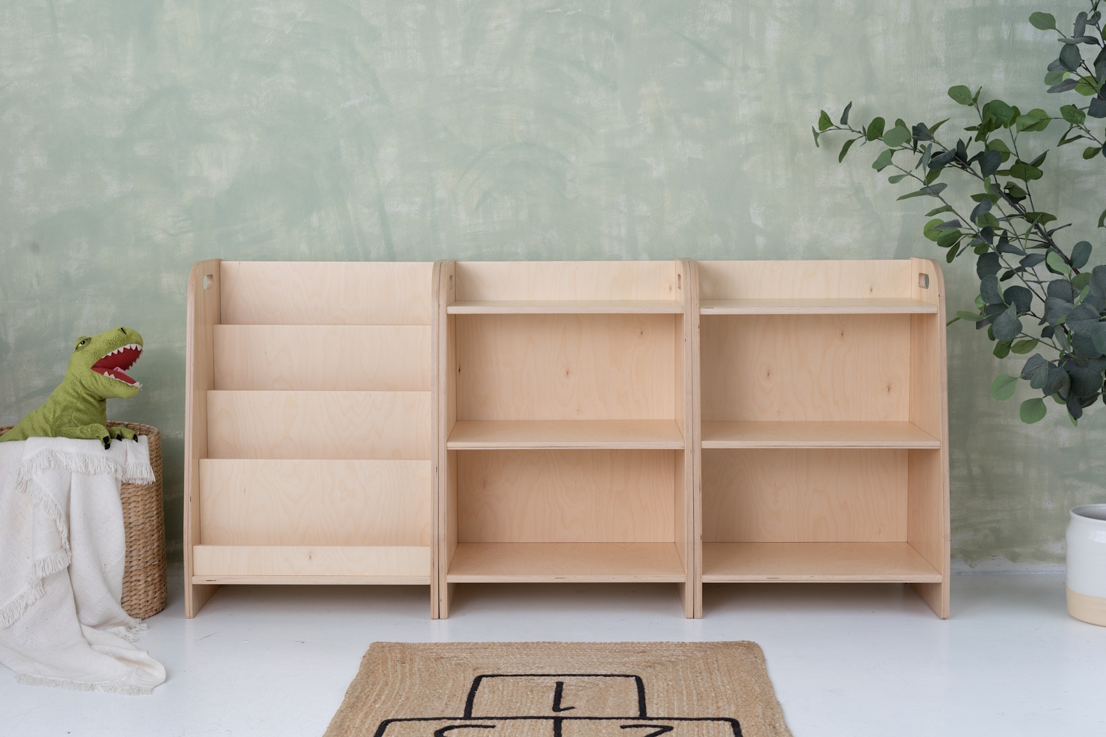 The toy shelf and bookshelf are handmade from 15mm thick plywood made from hardwood. They have been painted entirely with environmentally friendly and child-safe varnishes and paints that meet, among other things, the conditions of the European standard PN EN 71.3.