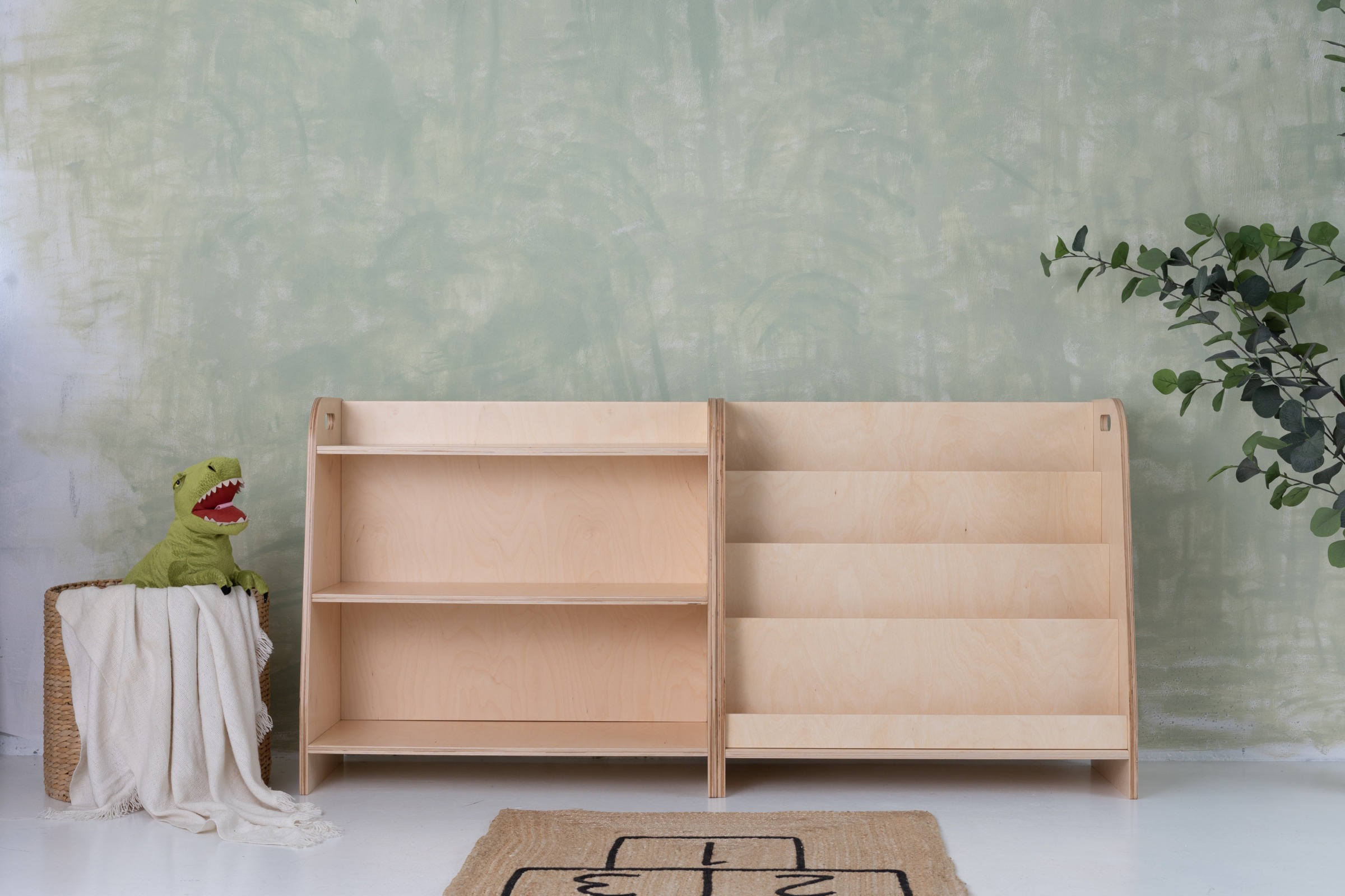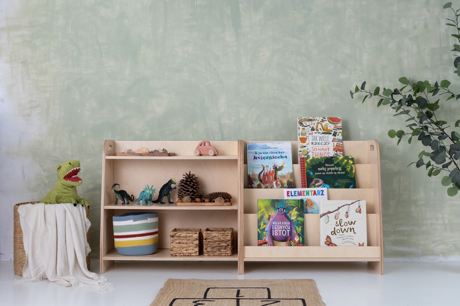 The toy shelf and bookshelf are handmade from 15mm thick plywood made from hardwood. They have been painted entirely with environmentally friendly and child-safe varnishes and paints that meet, among other things, the conditions of the European standard PN EN 71.3.