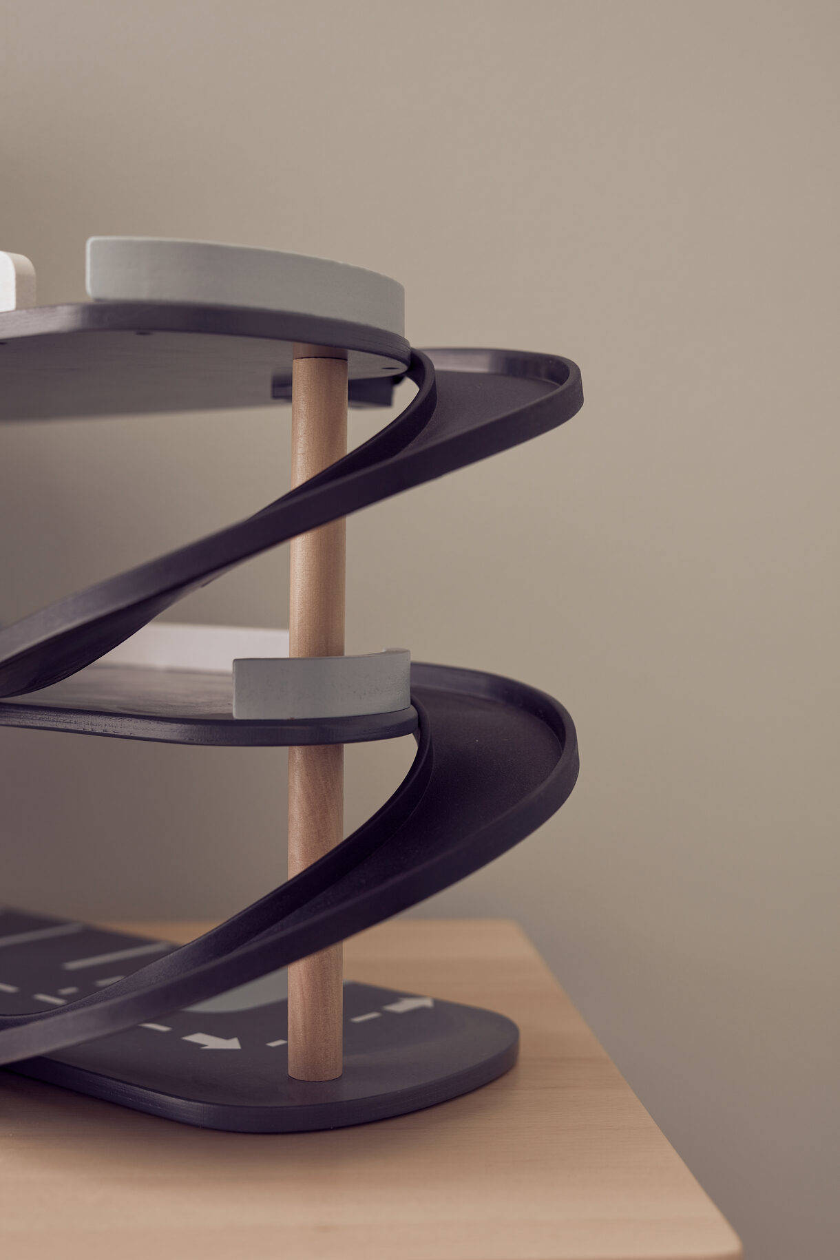 Wooden Garage play set, with three levels. It has everything your little one needs to create exciting adventures, speed up and down the ramps or take the wind-up lift to all levels, make sure to stop at the toll barrier, or buckle up and take the helicopter with it's own helipad. Included 3 cars 1 helicopter