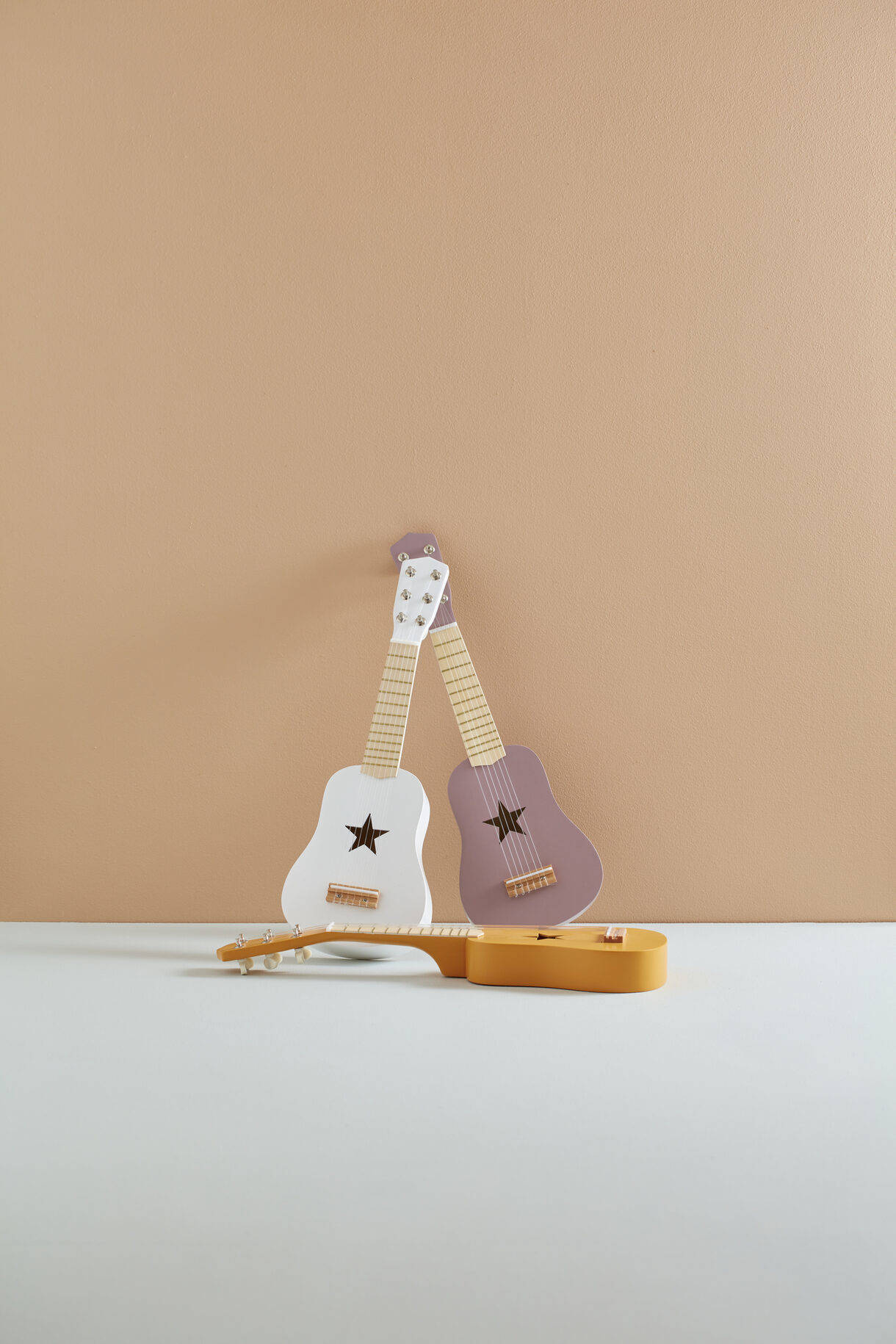 Wooden toy guitar with a star cut-out.